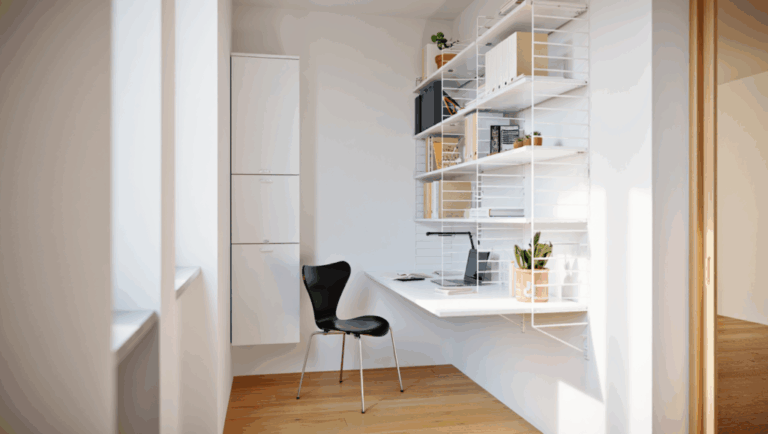 En pladsbesparende løsning til det lille hjemmekontor med et væghængt String System skrivebord.