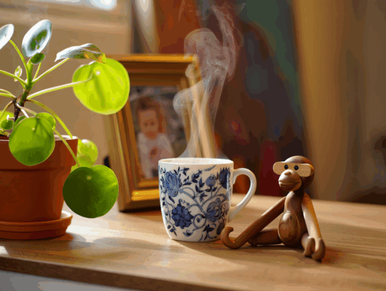 Personlige detaljer som en grøn plante, en kop kaffe og en Kay Bojesen træfigur gør hjemmekontoret hyggeligt og til et sted, man har lyst til at opholde sig.