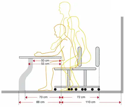 Tegningerne nedenfor viser minimumskravene og de optimale mål for benplads. Efter kontorstolen er indstillet korrekt, skal arbejdsbordet indstilles. Lad armene hænge ned langs kroppen. Uden løftede og spændte skuldrene, bøj albuerne. Bordet skal støtte dine underarme uden at spænde i skulderne.