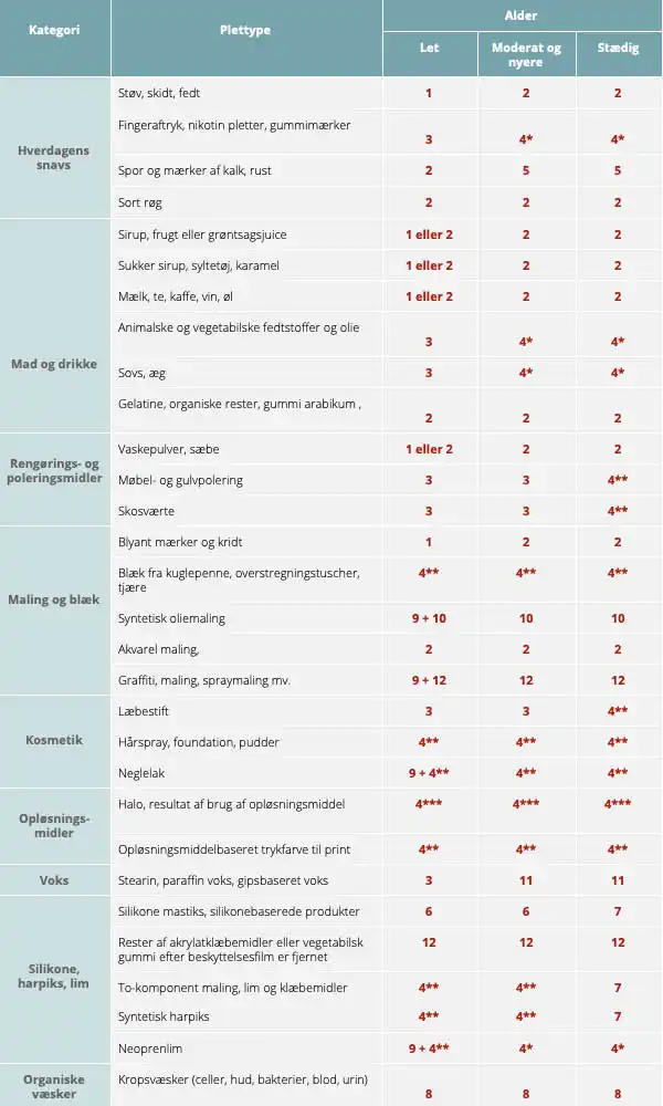 Vi har lavet en liste over de mest almindelige pletter og hvordan du begår dig med at fjerne pletten. I skemaet ser du plettypen efterfulgt af nogle numre.Numrene repræsenterer forskellige metoder til at fjerne pletter på nano laminat. Nedenunder skemaet kan du se de forskellige metoder i en liste.