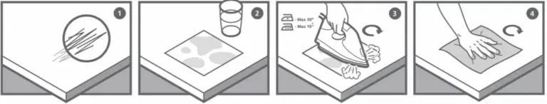 - Undgå blegemidler og klorholdige produkter, da de kan nedbryde overfladen. Natriumhypochlorit bør kun anvendes i koncentrationer under 5% og ikke mere end 5 minutter ad gangen, derefter skylles det af med en svamp eller en klud.