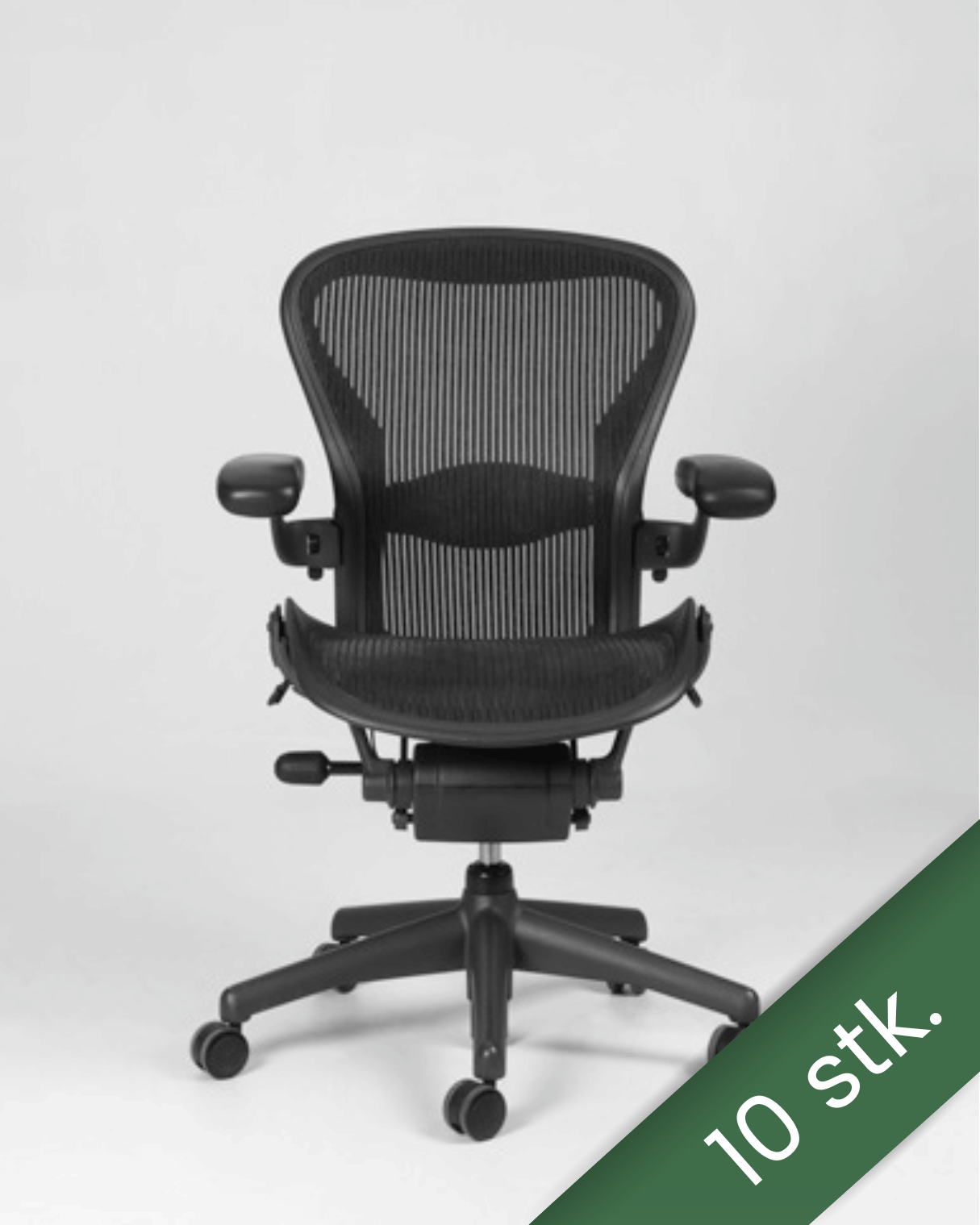 "SÆT à 10 stk – Herman Miller Aeron Classic kontorstole i størrelse B i sort med gråt (graphite) fodkryds og ramme.