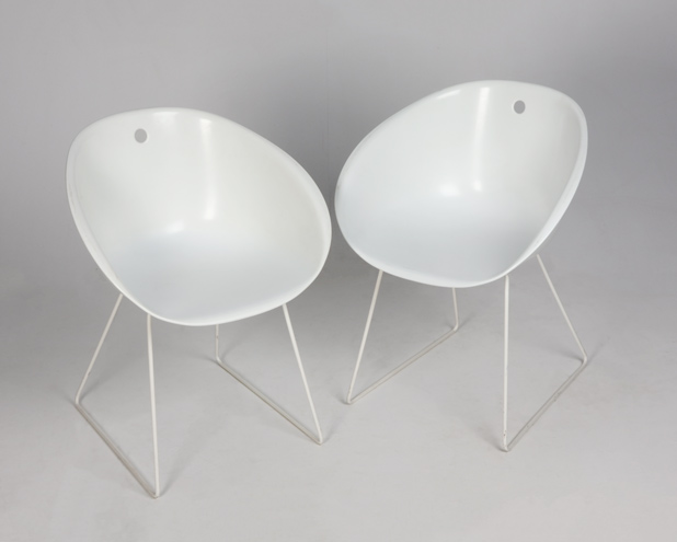 "Sæt på 2 stk. konference- og loungestole med skal i formstøbt hvid akryl og hvidt pulverlakeret medestel.