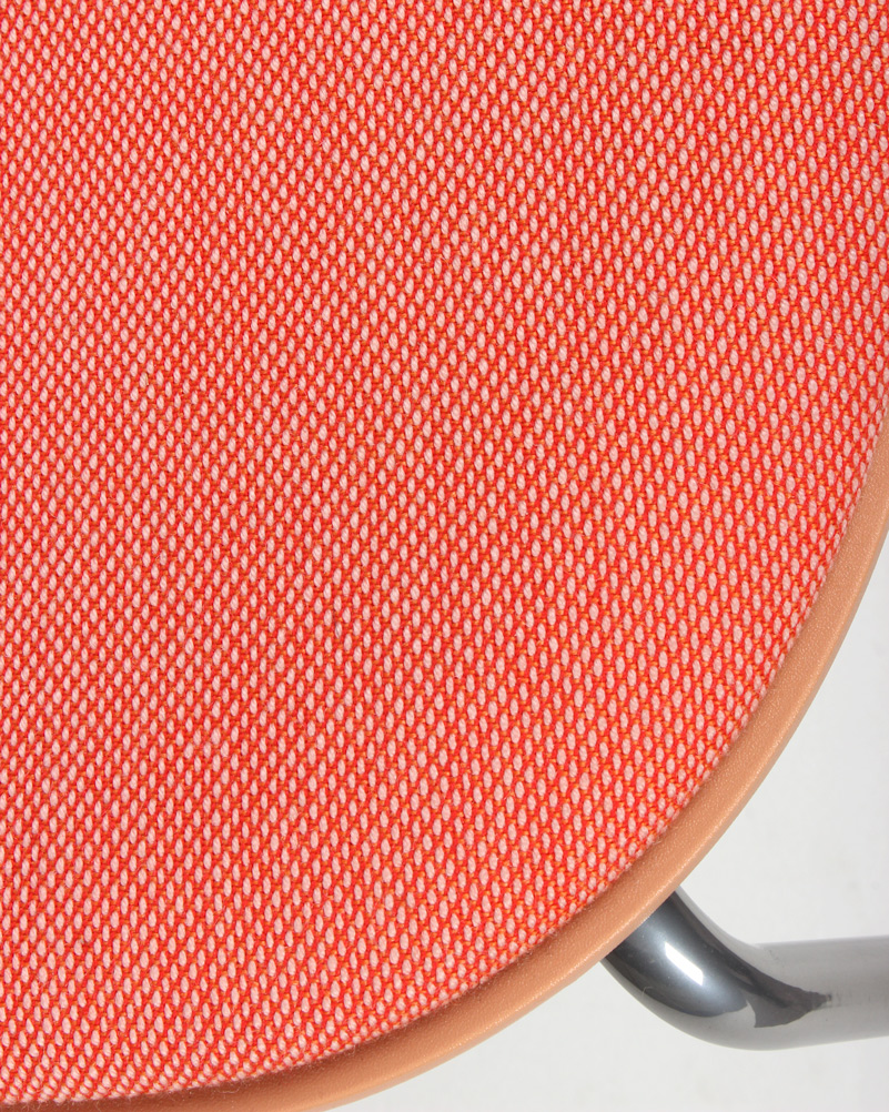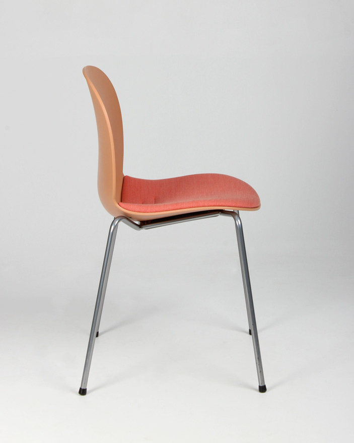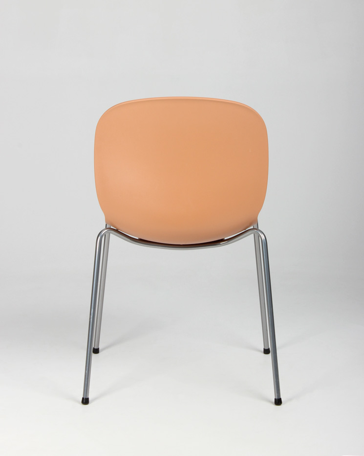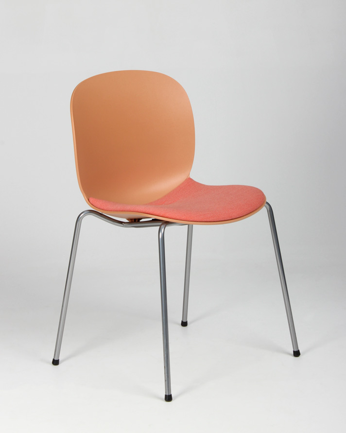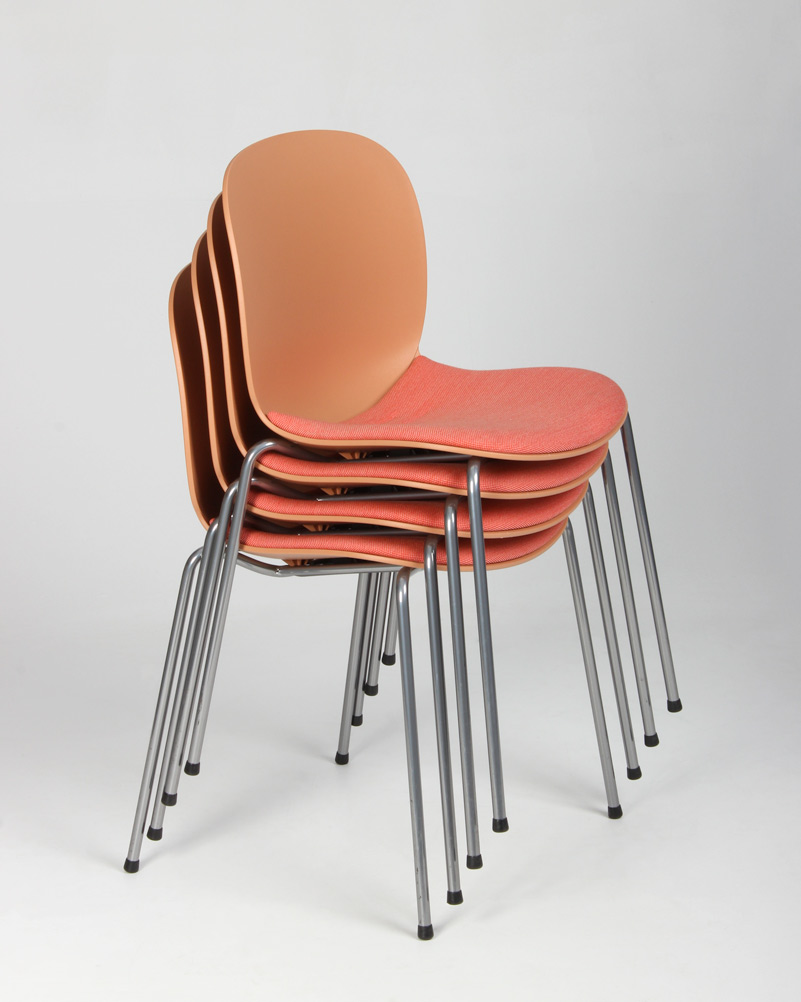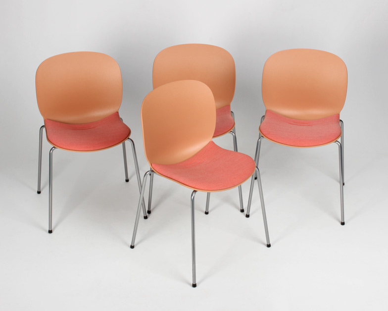 "Sæt på fire RBM Noor 6050S stabelbare stole i ferskenfarvet polypropylen med meleret coral-farvet sædepolstring. Det rengøringsvenlige og slidstærke materiale, gør stolen til et godt valg i f.eks i kantine eller frokoststue, hvor man desuden kan have en ekstra stak stole stående, og hurtigt fjerne eller tilføje en stol efter behov.