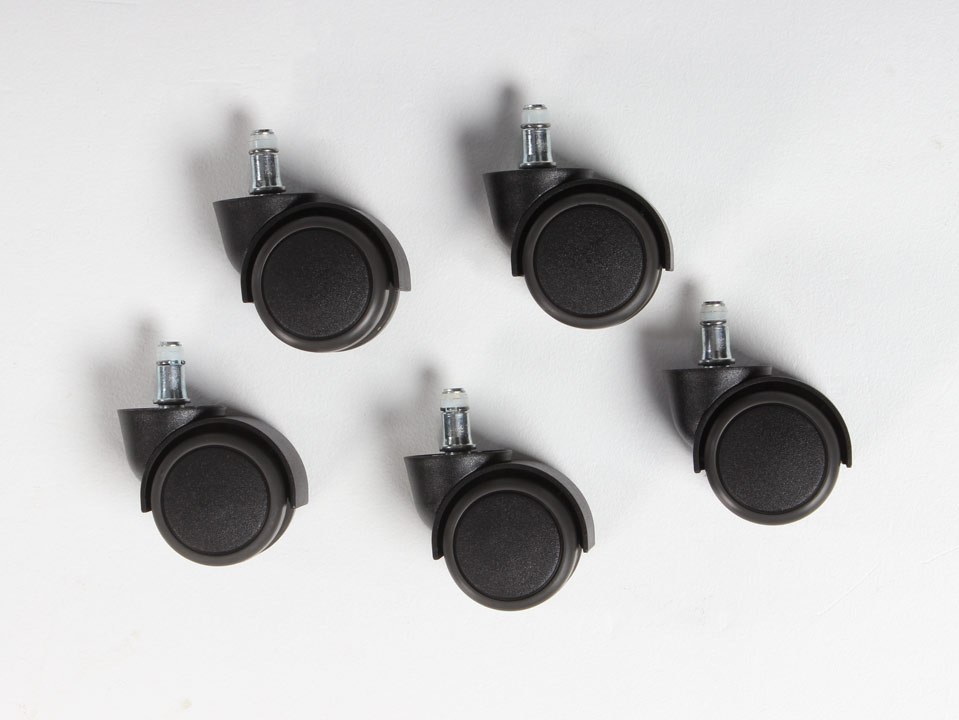 "Sæt på 5 stk Ø50 mm gummibanehjul, særligt til brug på trægulve og lignede underlag og passer til HÅG’s kontorstole. Hjulene har en indbygget let bremsende effekt der aktiveres når stolen ikke vægtbelastes, og sikrer derved at stolen ikke ruller hurtigt baglæns når man rejser sig. Udskiftes nemt og uden brug af værktøj.