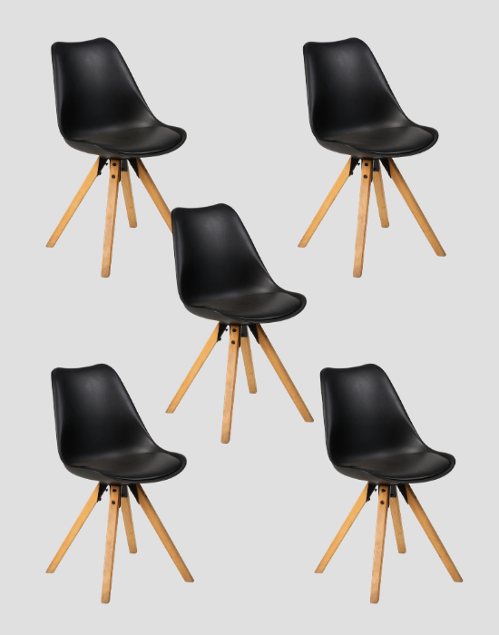 "Sæt på 5 stk. stole i sort plast med polstret sæde og egestel.