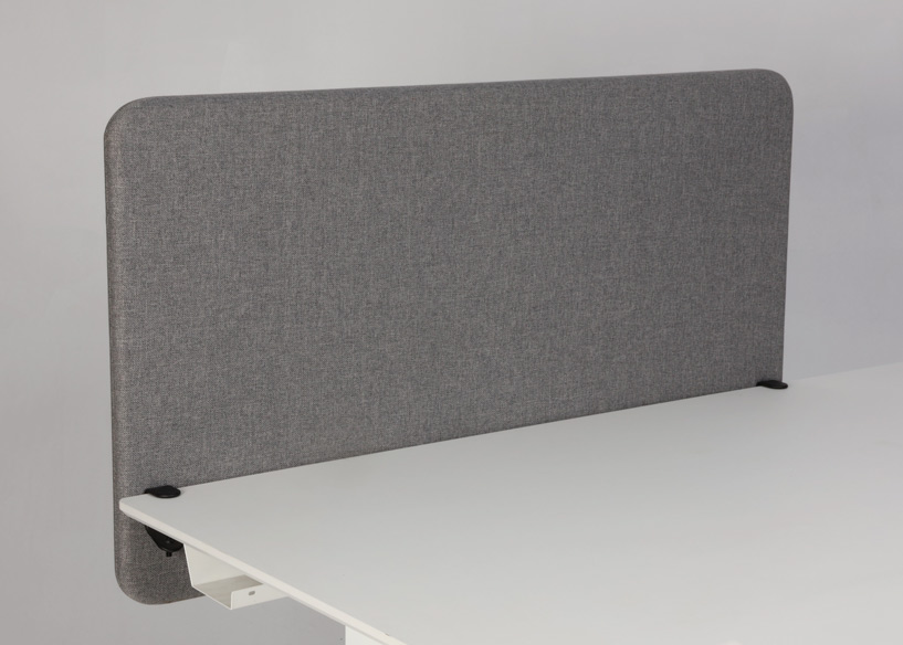 "Abstracta bordskærm i gråmeleret med sorte monteringsklemmer. Foruden den primære funktion, at afskærme for uro og høje lyde, er bordskærmen endvidere anvendelig som opslagstavle.