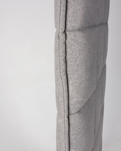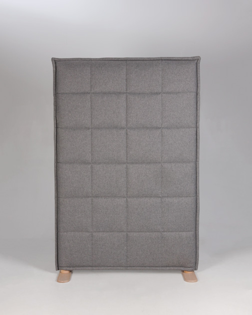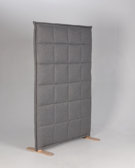 "Abstracta Stitch skillevæg i grå med lakerede træfødder. Elegant rumdeler der er en god løsning til at optimere akustikken, at reducere støj på, og samtidigt skabe arbejdsro og diskretion for personalet – eventuelt i større og åbne kontormiljøer.