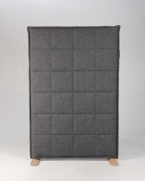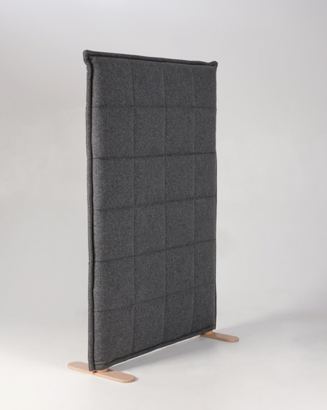 "Abstracta Stitch skillevæg i mørkegrå med lakerede træfødder. Elegant rumdeler der er en god løsning til at optimere akustikken, at reducere støj på, og samtidigt skabe arbejdsro og diskretion for personalet – eventuelt i større og åbne kontormiljøer.