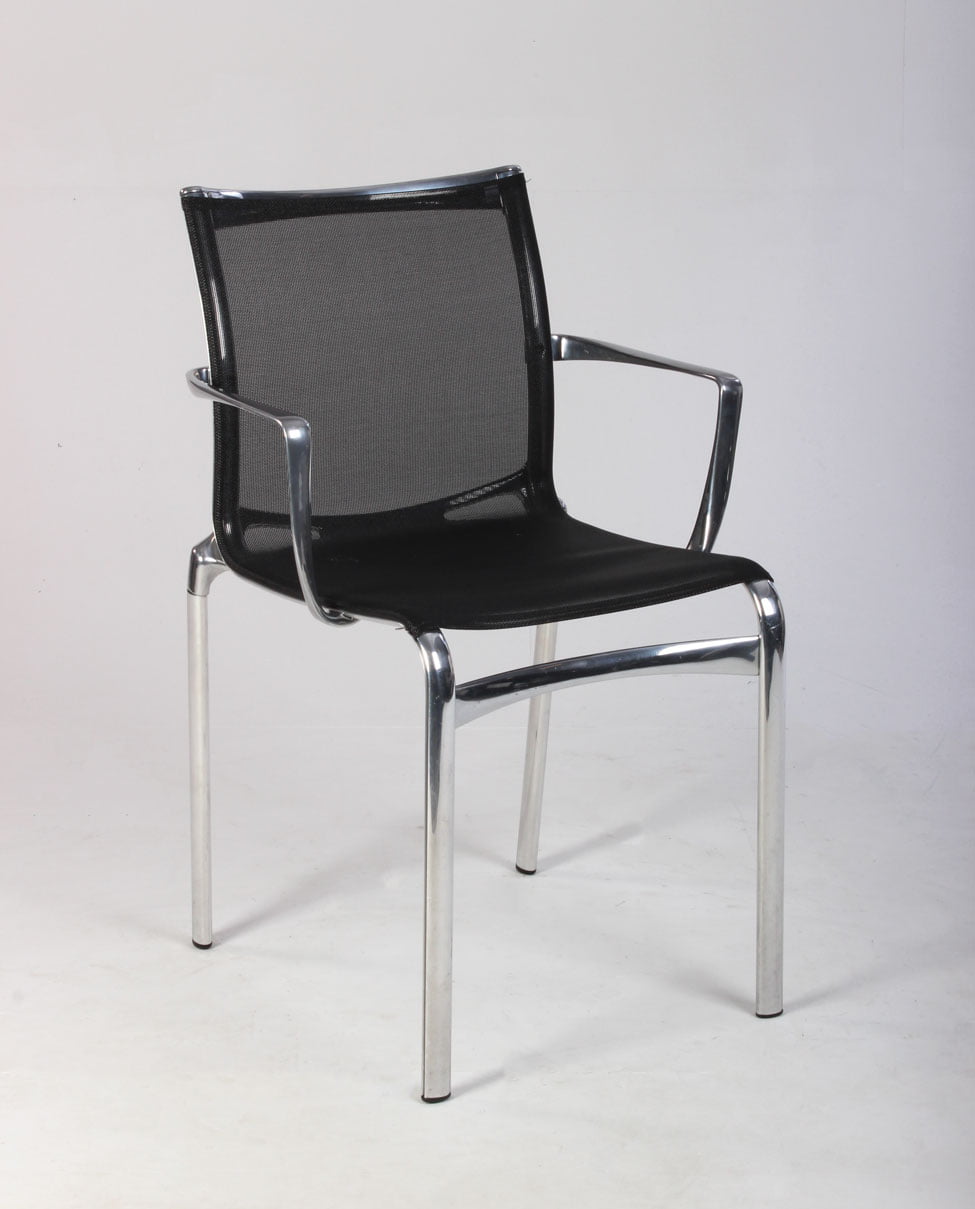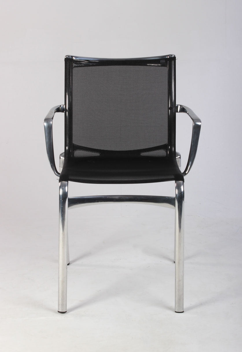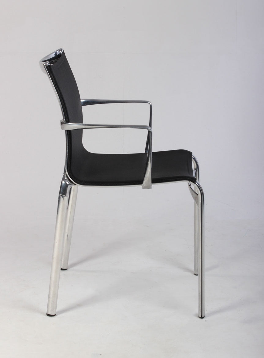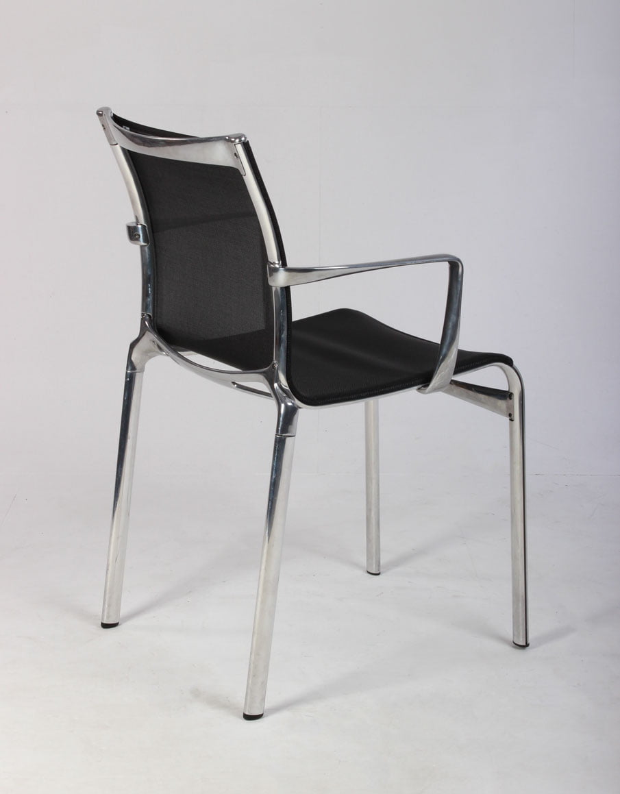 Stel i poleret stål med sort sæde og ryglæn i den åndbare stoftype, mesh.