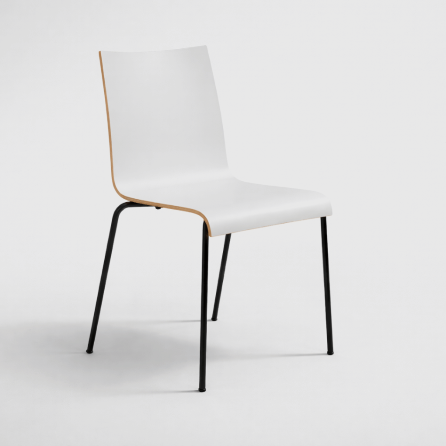 Stolen er udført i formspændt lamineret krydsfinér med stel i sort pulverlakeret stål og har en hvid front samt en skarp orange bagside.