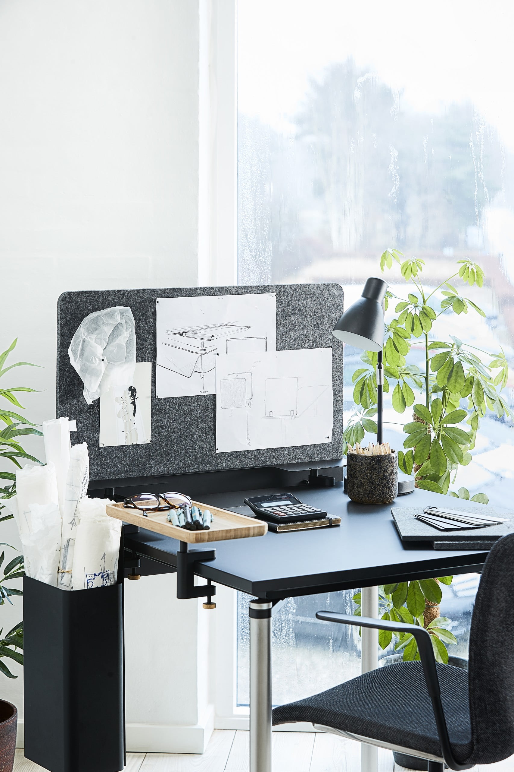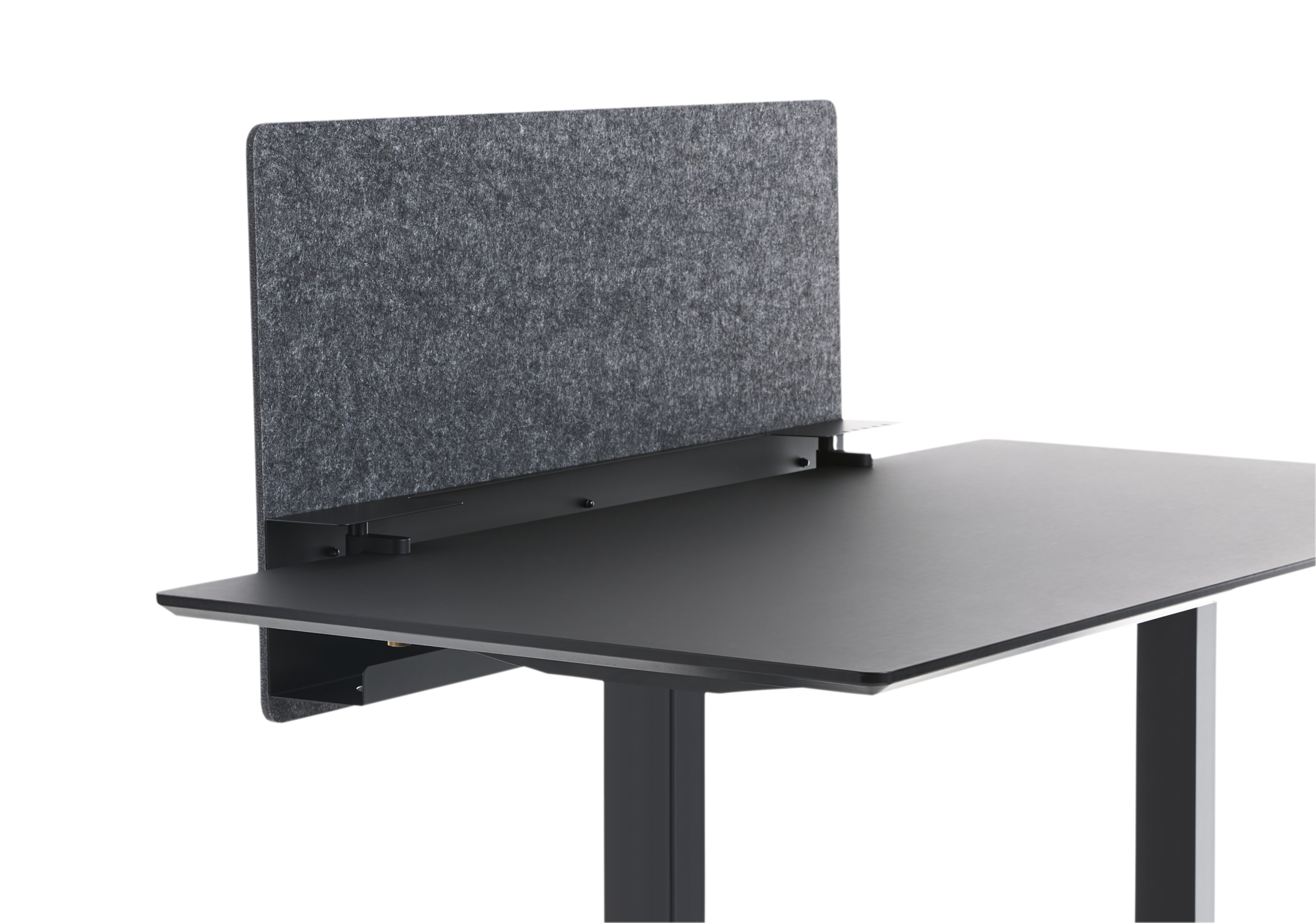 Fabriksny APTO 110 cm bordskærm, kabelbakke- og styring i én løsning. Den smarte afskærmningsløsning kombinerer opbevaring og styring af ledninger fra udstyr, muligheden for opslagstavle samtidigt med at skabe arbejdsro og lokale og for medarbejderen. Skærmen fastgøres til bordkanten med to medfølgende monteringsklemmer, og efterlader ikke huller, såfremt den ønskes omplaceret. Designet med omtanke for naturen – filten er fremstillet af 70% upcyclede plastflasker.