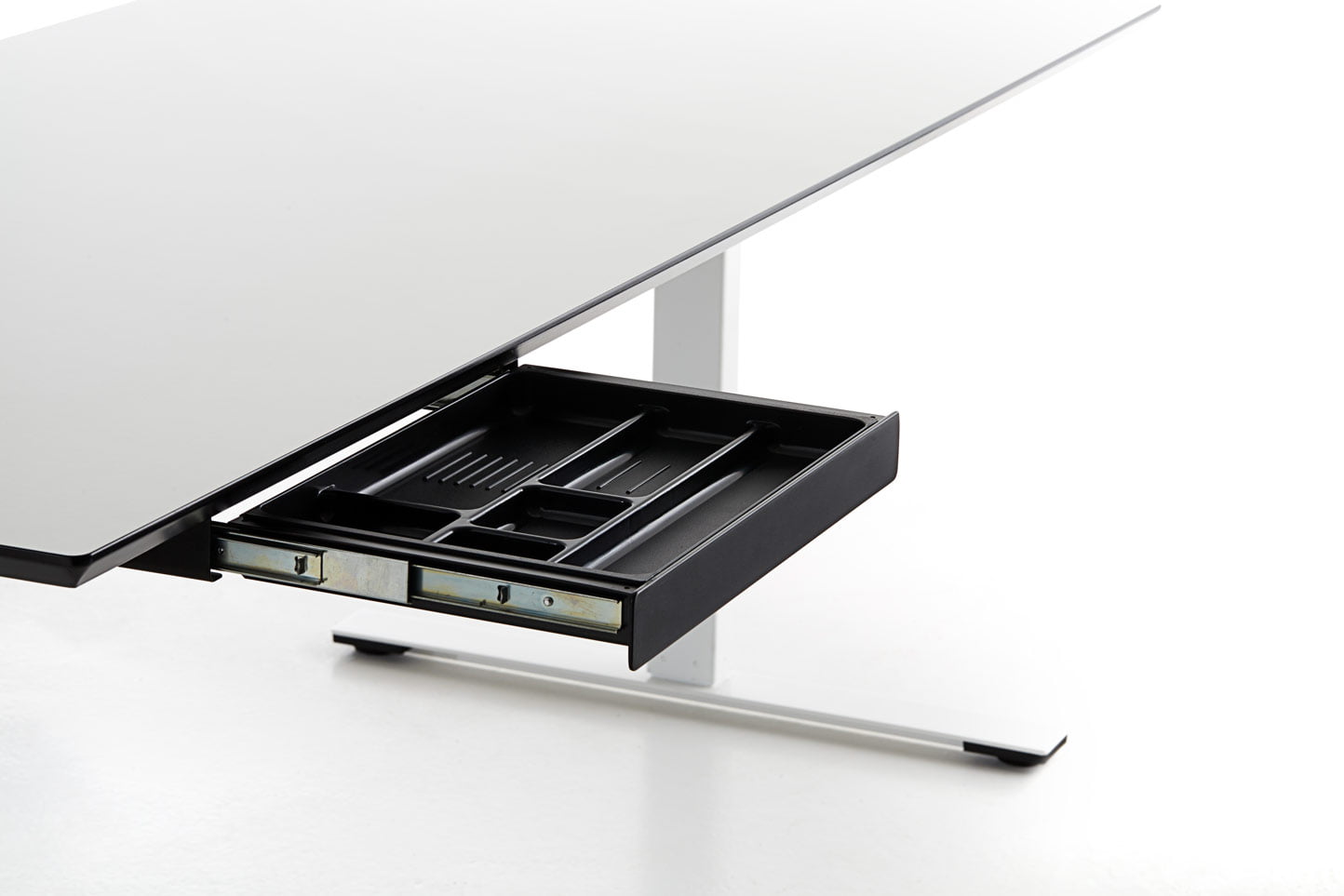"Bred udtræksskuffe i grå metal, til montering under hæve-/sænke- eller skrivebordet. Skuffen har udtagelig pennebakke og er en diskret og enkel opbevaringsløsning, til kuglepenne og mindre kontorartikler. Denne variant passer ikke til hæve-/sænkebord med mavebue – tilvælg i stedet den smalle udgave.