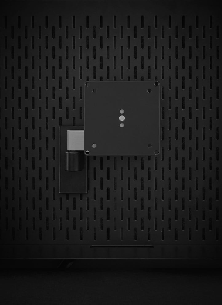 Holderen flyttes nemt rundt på tavlen, så den rette arbejdshøjde opnås. Holderen består af tre dele; ophæng, forlængerled på 150 mm. i aluminium samt et universalbeslag der kan anvendes til alle skærme, da den måler både 75 x 75 og 100 x 100 mm.