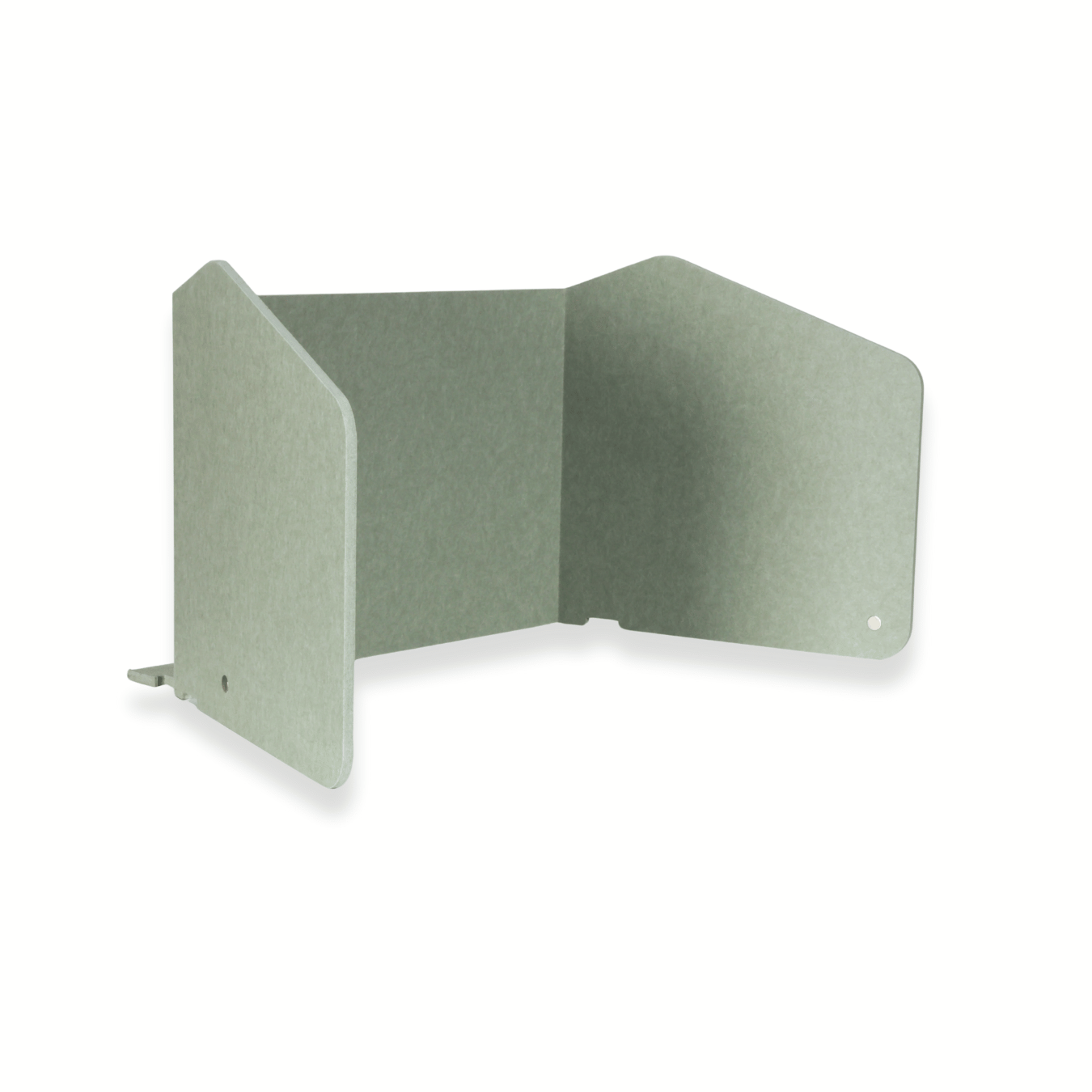 "Smart, flytbar afskærmning fra APTO PLUS i lys grøn filt med greb. Skærmen kan vendes to veje – enten med udgang til ledninger og let afskærmning af lyset ovenfra, eller med grebet nedad der åbner op for et større lysindfald ovenfra.