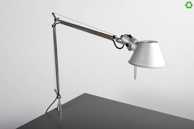 "Tolomeo Mini Tavolo skrivebordslampe fra Artemide, med bordbolt til montering gennem bordpladen. Lampen har krom arm samt lampehoved i mat aluminium, som kan justeres 360° for optimal belysning. Ved montering kræves det, at der bores et hul på Ø18 mm i bordpladen. Tolomeo-lampen er designet i 1987 og har vundet adskillige designpriser.