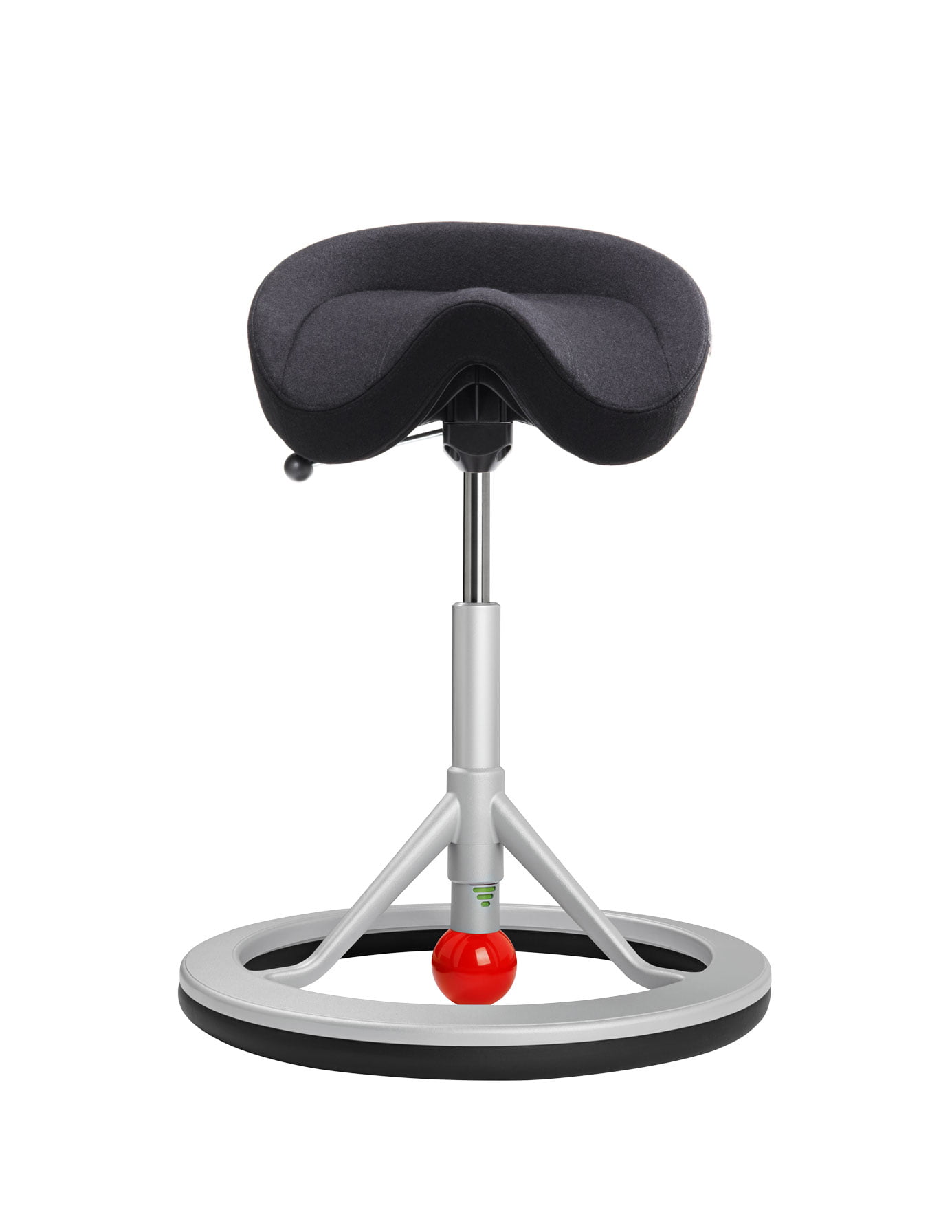 "Backapp Smart 2.0 ergonomisk kontor- og sadelstol med sæde i sortgrå uld på gråt stel med rød kugle.