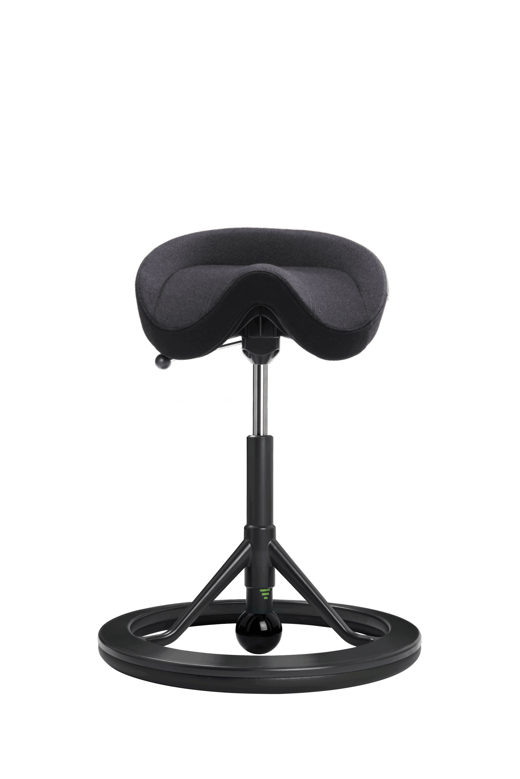 Backapp Smart 2.0 ergonomisk sadel- og balancestol med sæde i sortgrå uld på sort stel med sort kugle. Backapp Smart er en unik, moderne kontorstol med ergonomien i fokus. Når du sidder på Backapp Smart 2.0, vil du naturligt bevæge dig og balancere på den centrale kugle, så rygmuskulaturen styrkes til gavn for eventuelle rygsmerter. Den justerbare højde på 54-77 cm, giver god mulighed for at variere mellem siddende og halvstående arbejdspositioner.