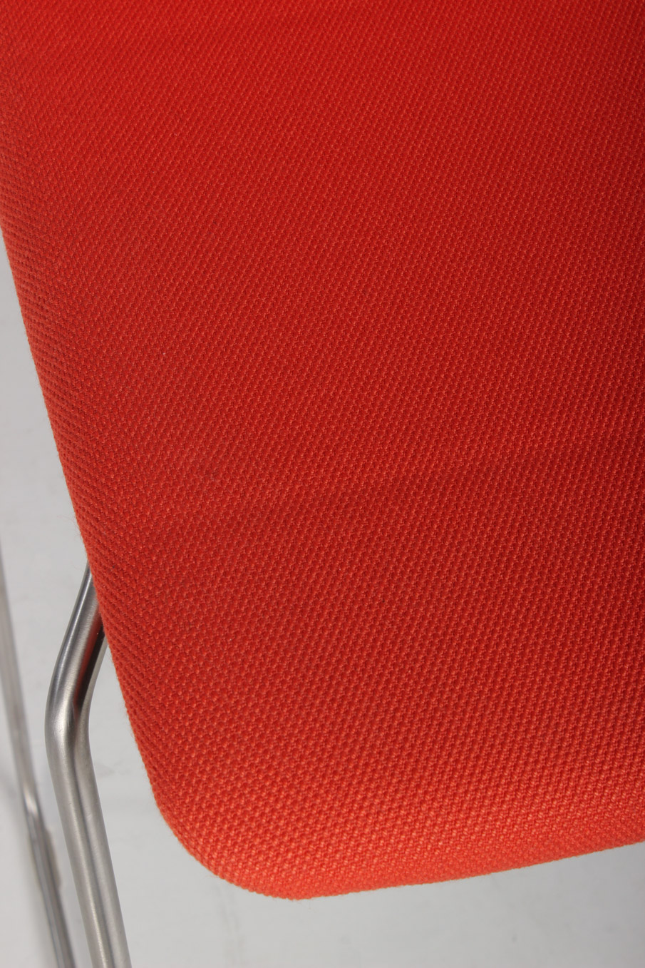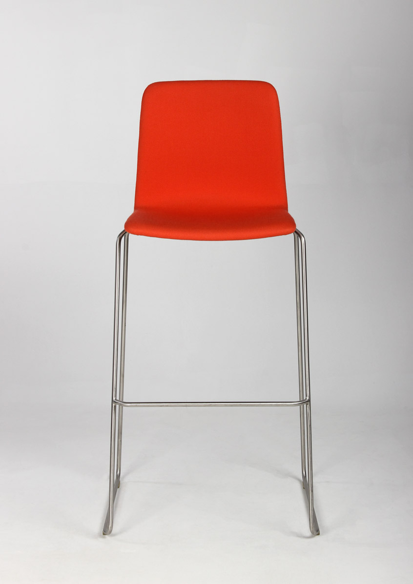 Stolen har medestel med fodhviler i børstet stål og kan stables.