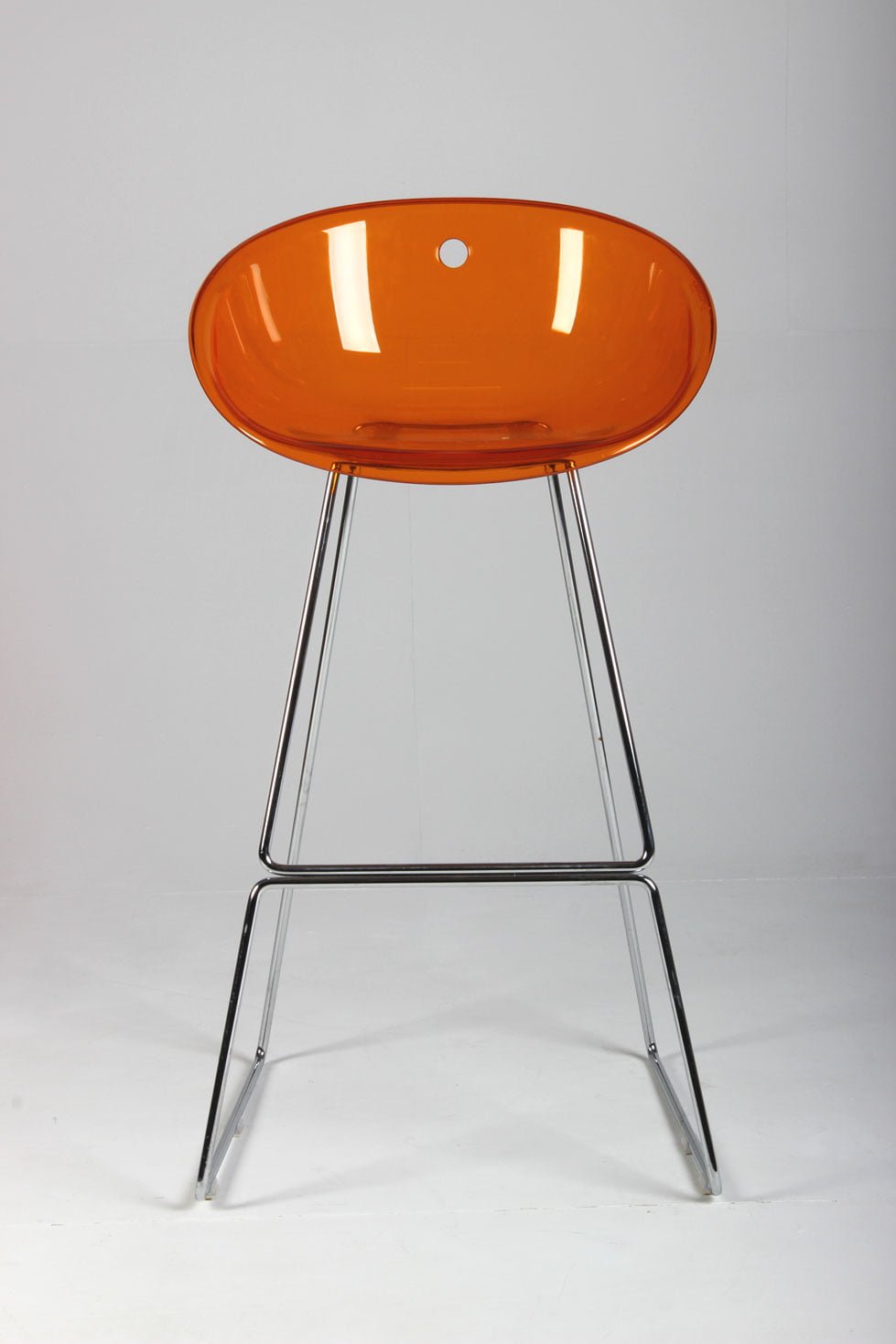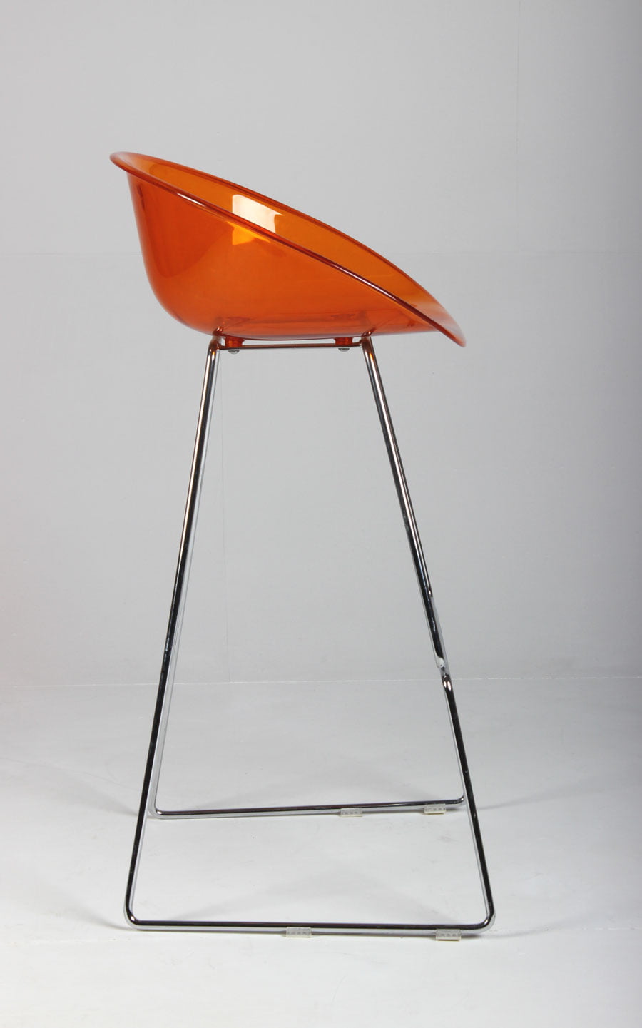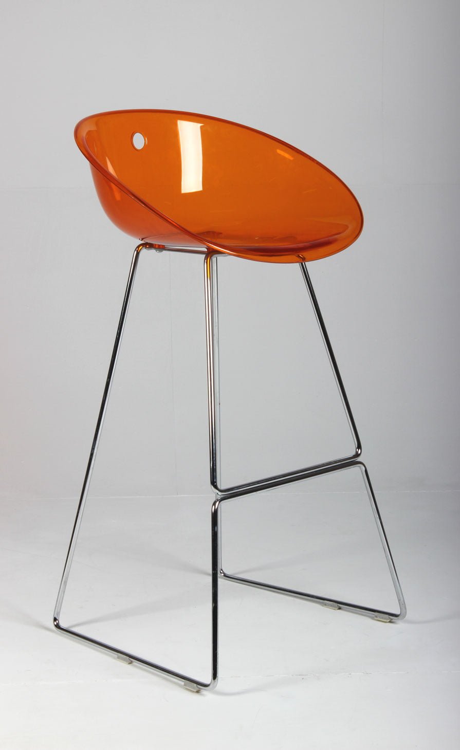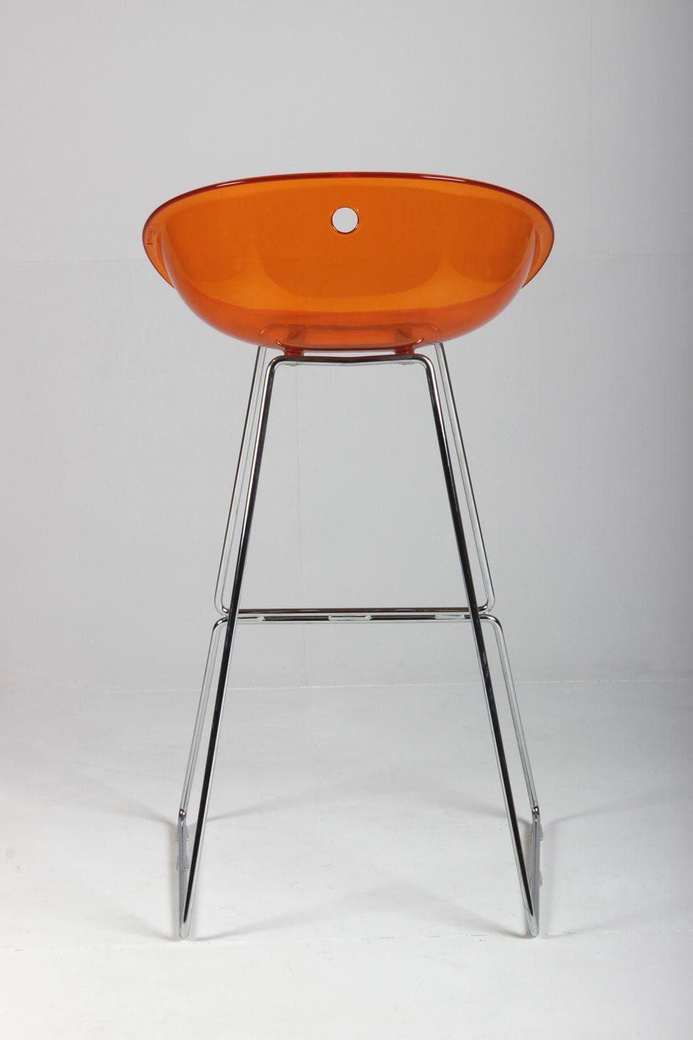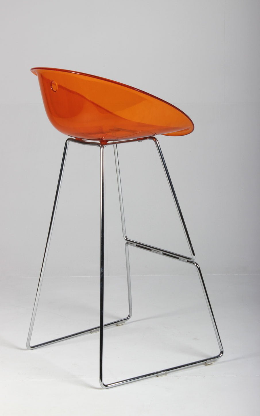 Barstol med orange akrylsæde på krom medestel med fodhviler.