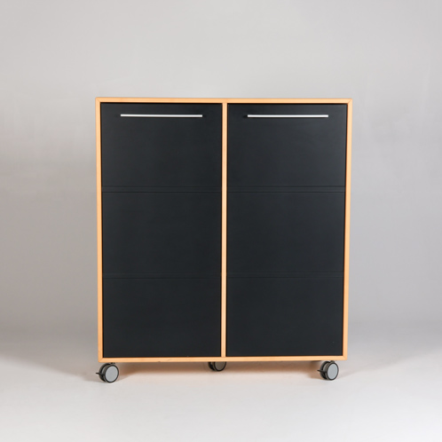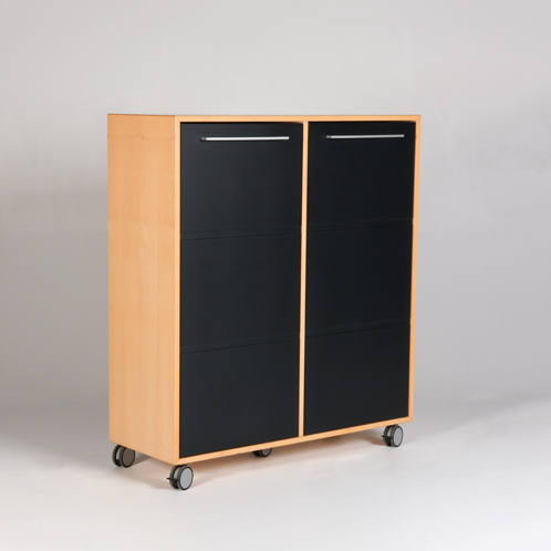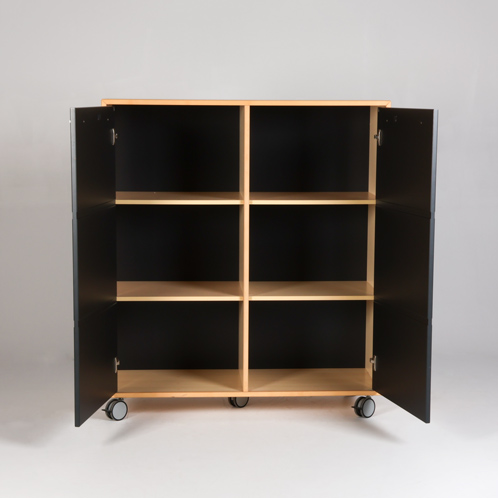 "Bondo Aura skab på hjul med to låger – i alt seks rum. Korpus i bøg med sortlaminerede fronter.