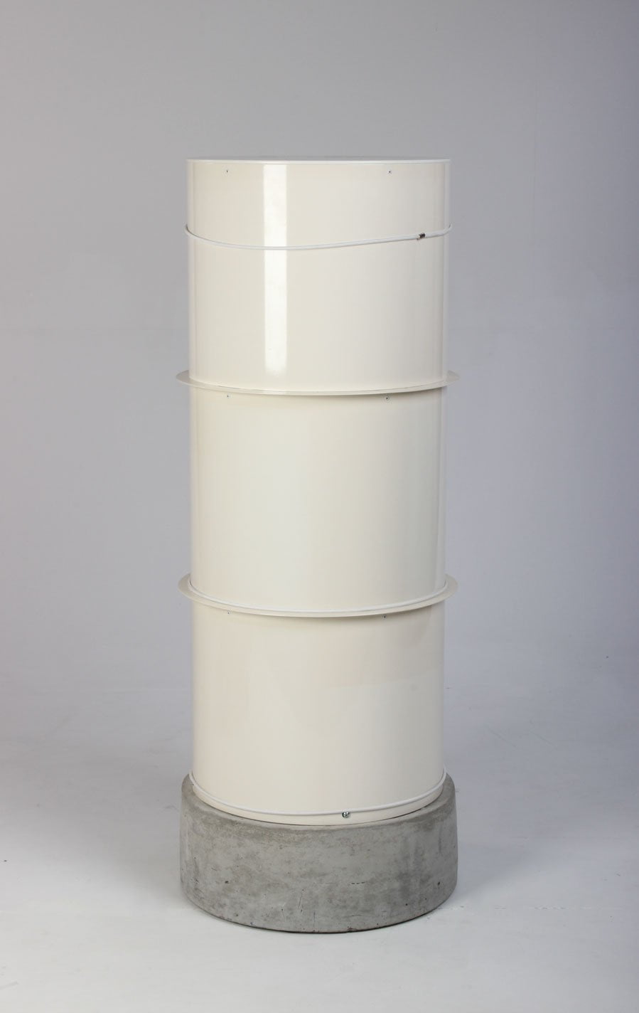 Søjlen er fremstillet i hvid metal med betonsokkel og har tre kraftige elastikker, der holder godt på foldere og brochurer.