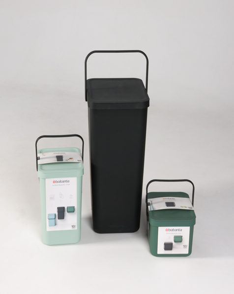 "Sæt på stk. Brabantia affaldsspande i robust plast med praktisk hank, når de skal tømmes.