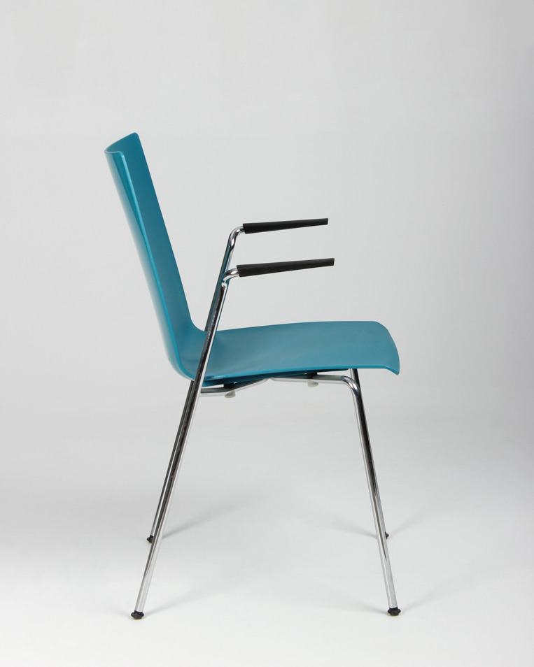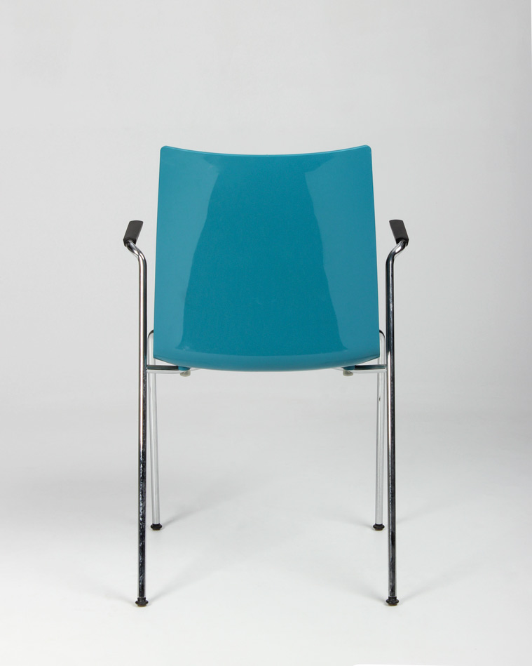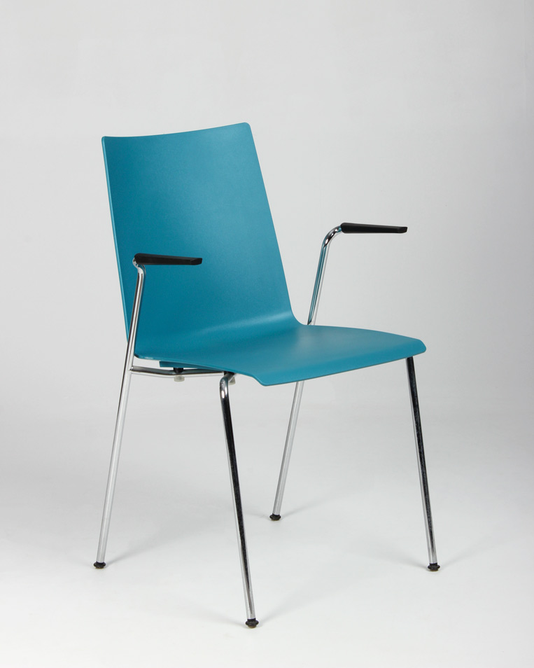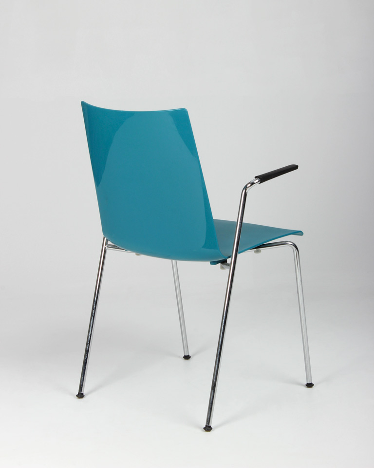 "Brünner kantinestol med skal i formstøbt plast og blank ryg. Stellets udformning gør den mulig at hænge op på bordkanten i armlænene, så det er lettere at komme til ifm. rengøring.