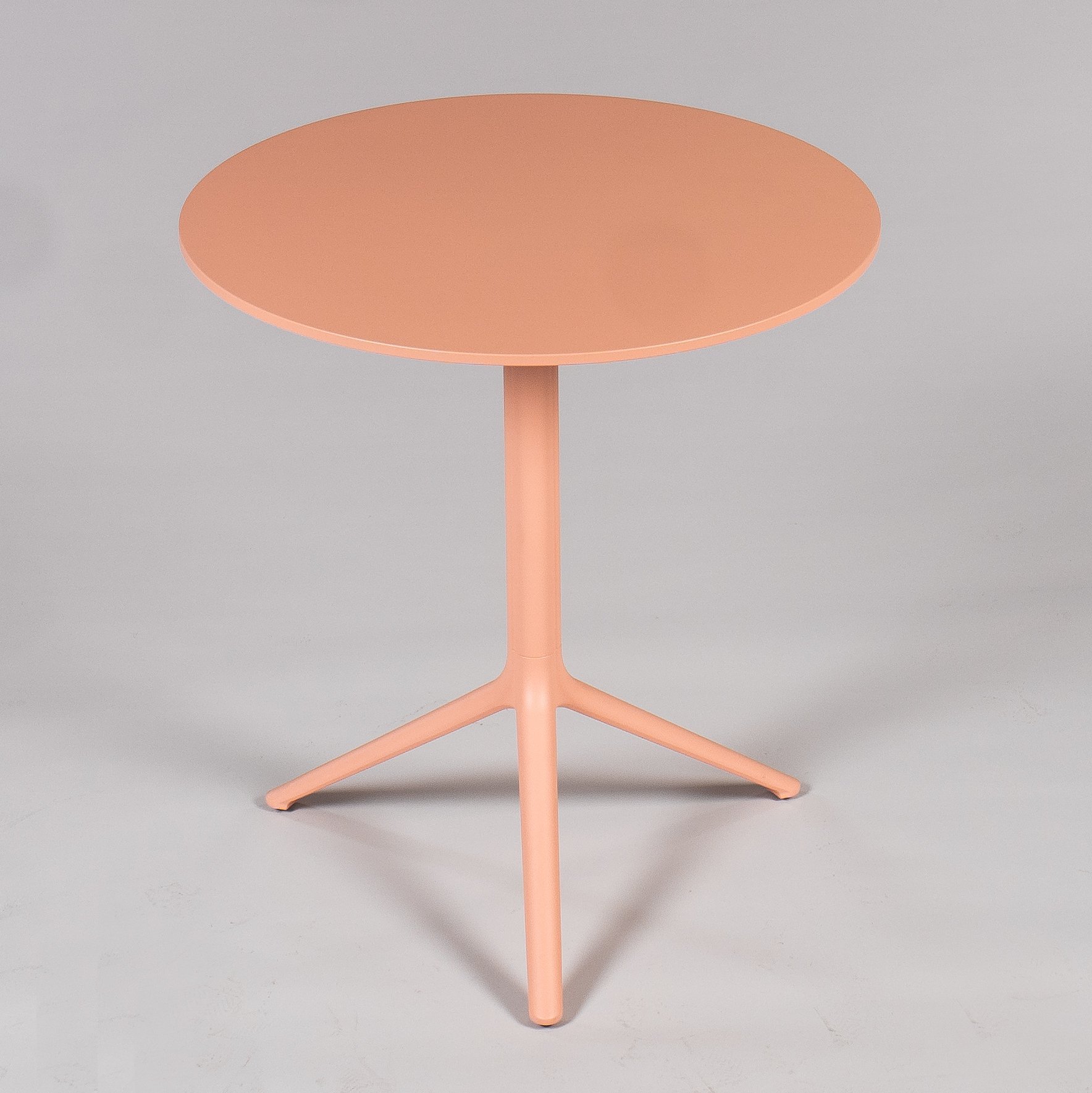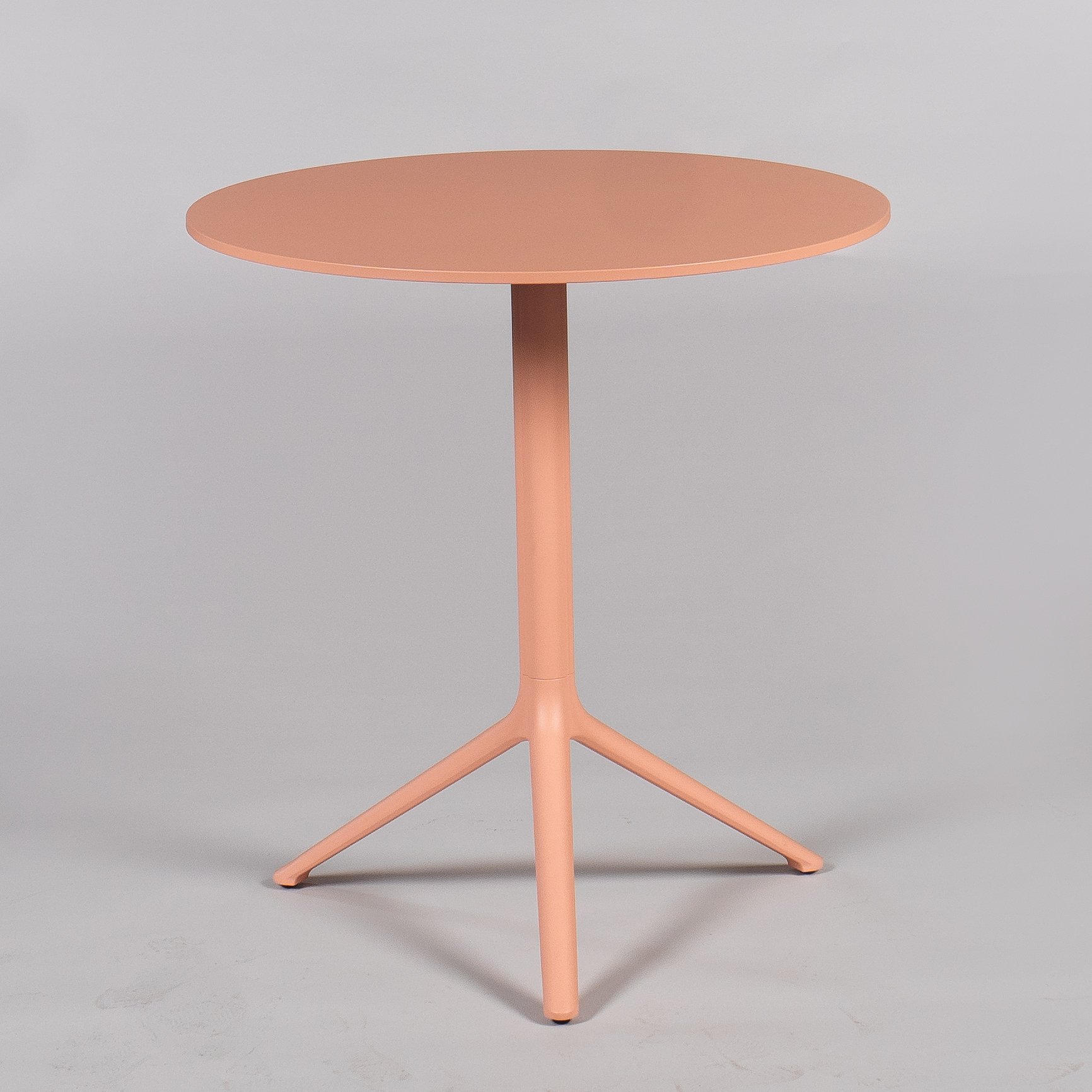"Flot cafébord udført i en sart rosa nuance med vipbar bordplade. Udført i aluminium og designet til både indendørs og udendørs brug.