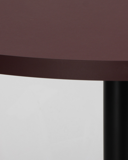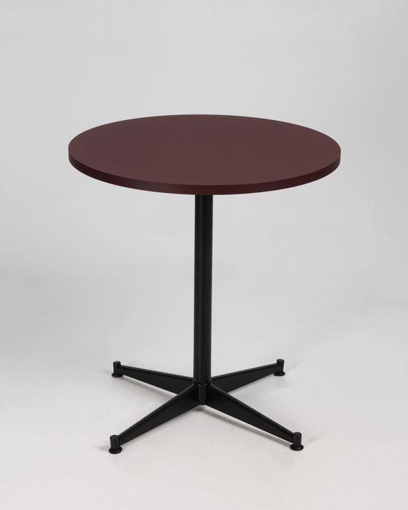 "Profim 5182 cafébord med bordeaux linoleumsbordplade med sort sokkel med stilleskruer.