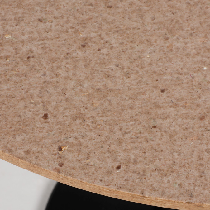 "Upcyclet cafébord med ny bordplade på brugt, robust sokkel i pulverlakeret stål med stilleskruer. Den runde bordplade er fremstillet af knuste, genanvendte bordplader og herefter lakeret. Et stilrent og bæredygtigt valg – perfekt til den miljøbevidste virksomhed!