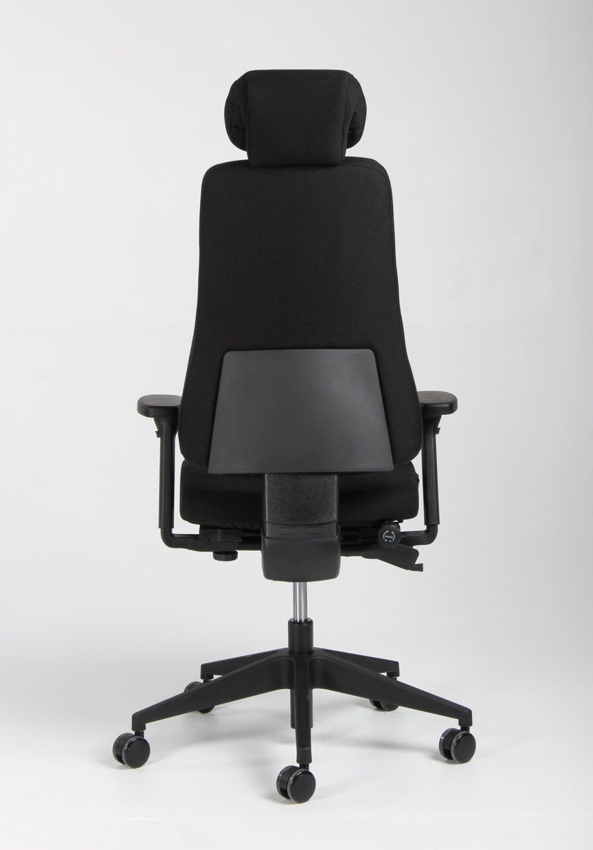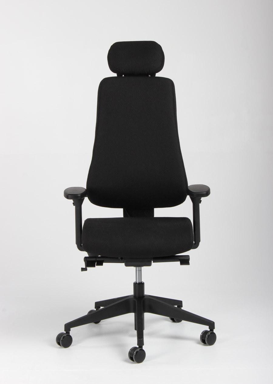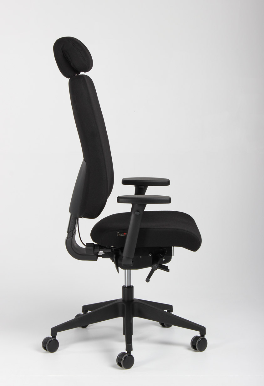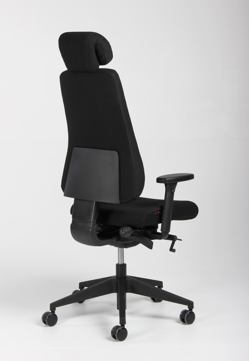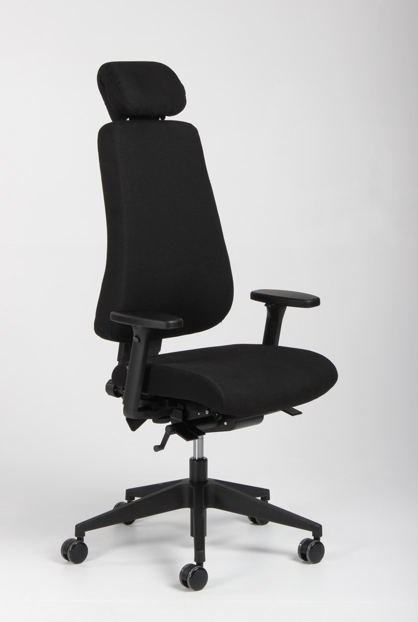 "Canadian Ergo CE 04 kontorstol i sort vævet uld med armlæn og nakkestøtte.