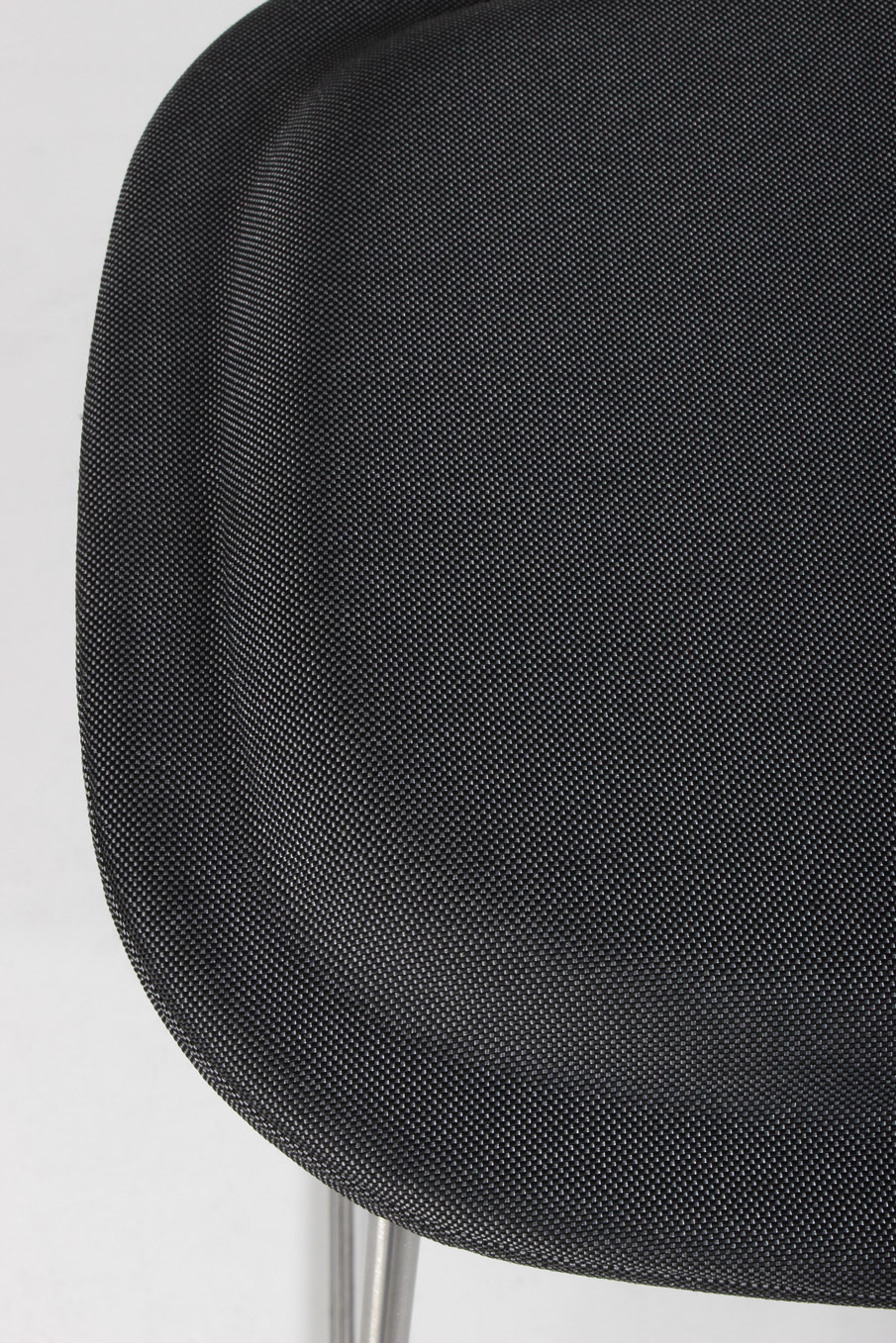 Stolen er med mørkgrå sædepolstring og stel i børstet stål med fodhviler.