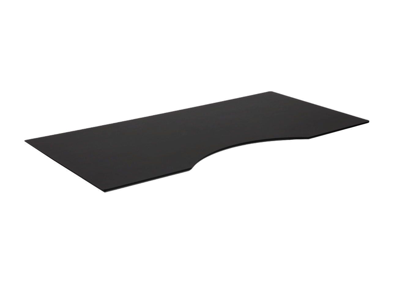 "Sort linoleumsbordplade med mavebue, afrundede hjørner (10 mm radius) og en affaset 45 graders kantprofil.