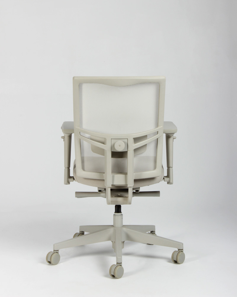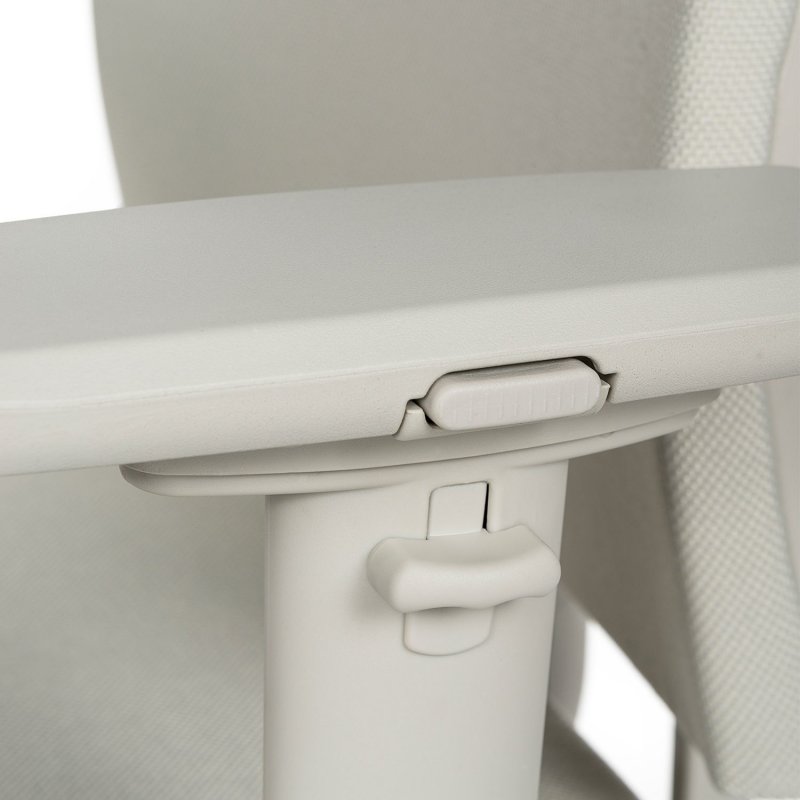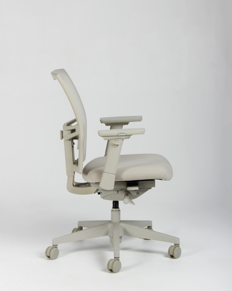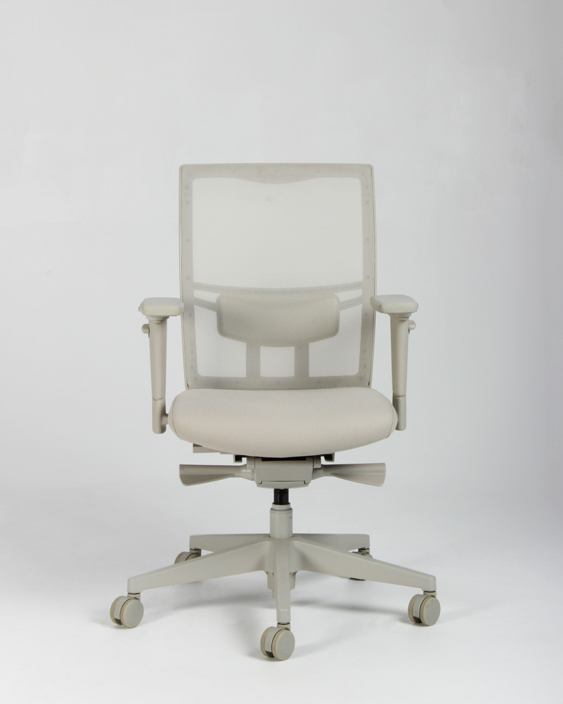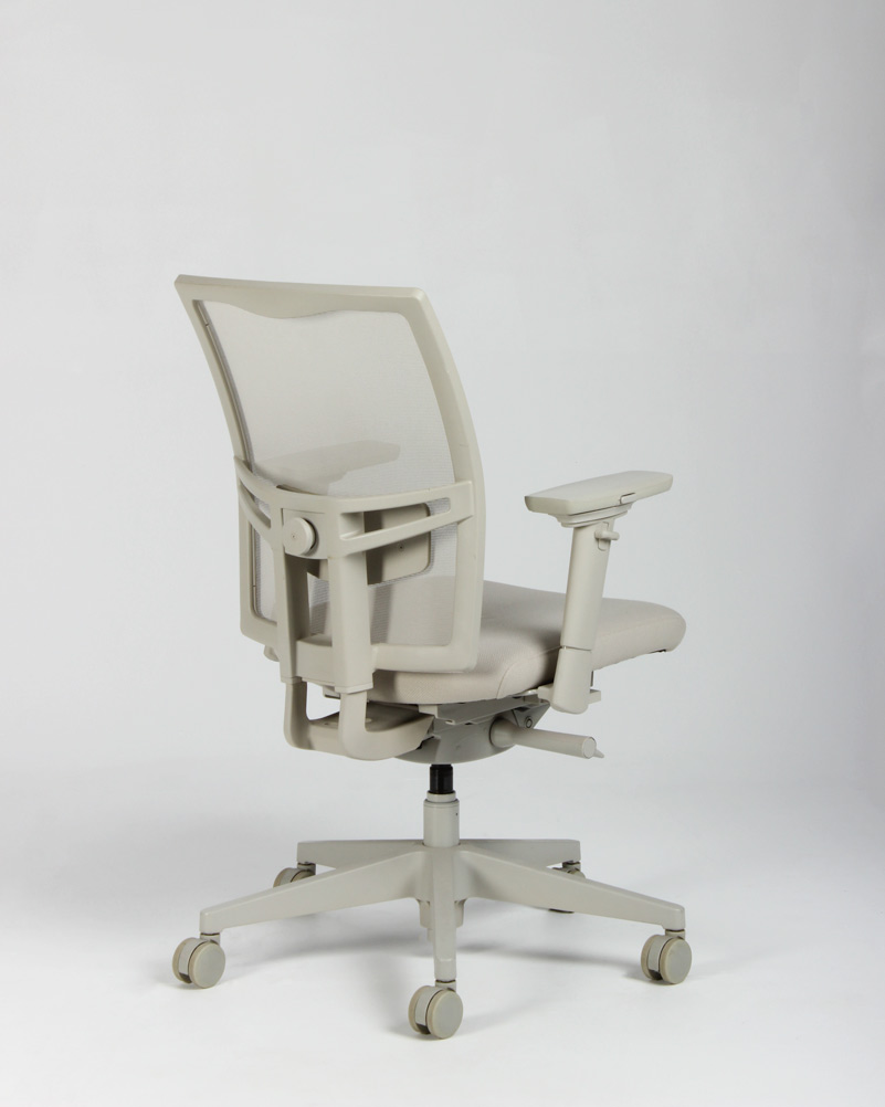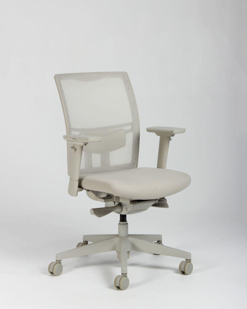 "Kontorstol med armlæn i lys beige. Stolen er udstyret med bl.a. højde-, bredde- og dybdejusterbare armlæn, synkronmekanisme med vægtregulering og har et behageligt velpolstret sæde samt åndbart et mesh-rygstykke med højdejusterbar lændestøtte.