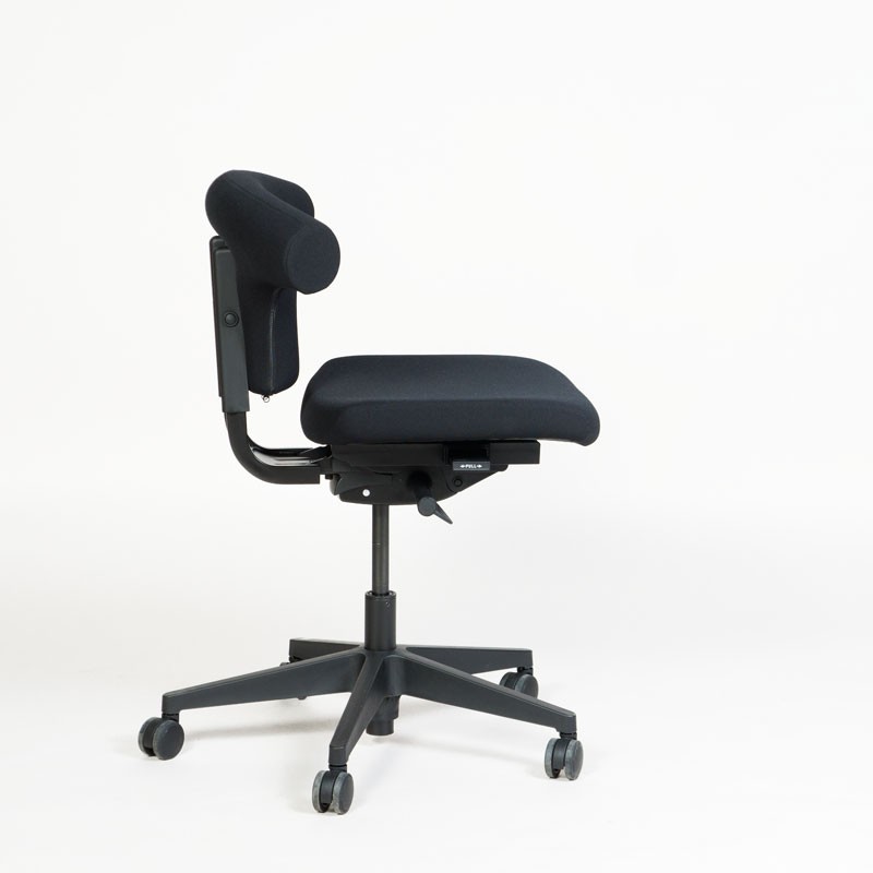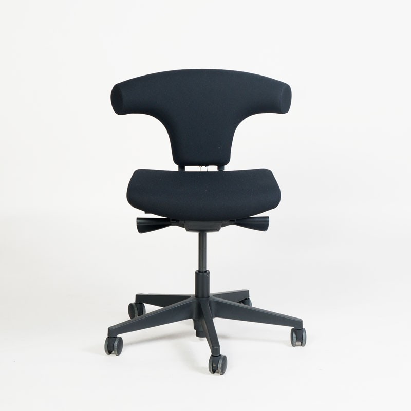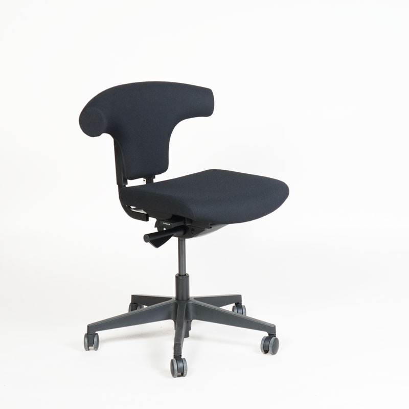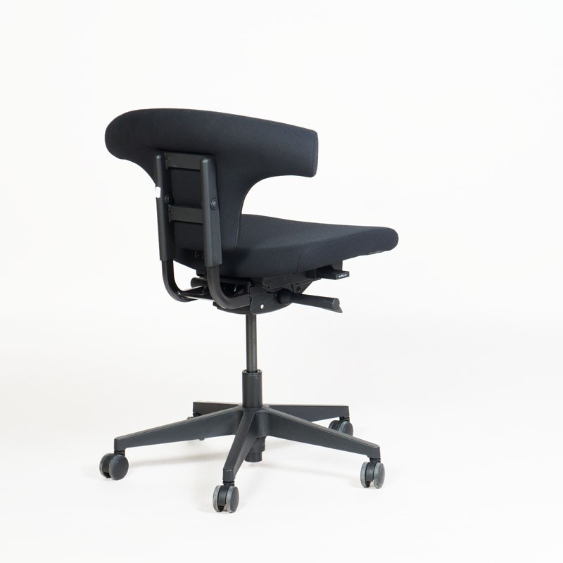 "SitOn Rind – ergonomisk og unik kontorstol med t-formet ryg i fuldpolstret sort Oasis stof. Det specieldesignede ryglæn gør, at man også kan sidde omvendt på stolen og bruge ryglænet som støtte foran.