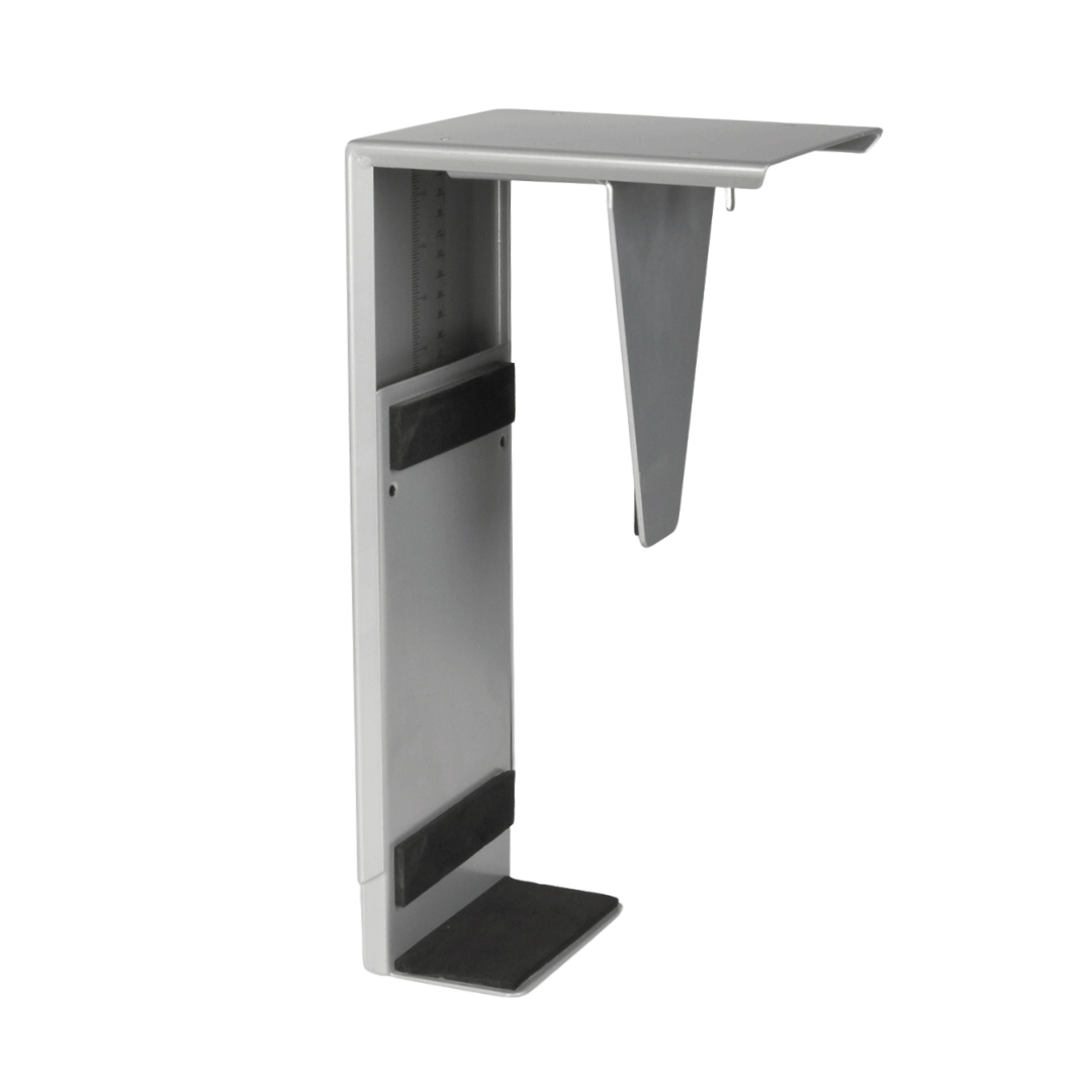 "Computerholder/PC-holder i grå metal til montering under bordpladen på skrive- eller hæve-/sænkebordet.