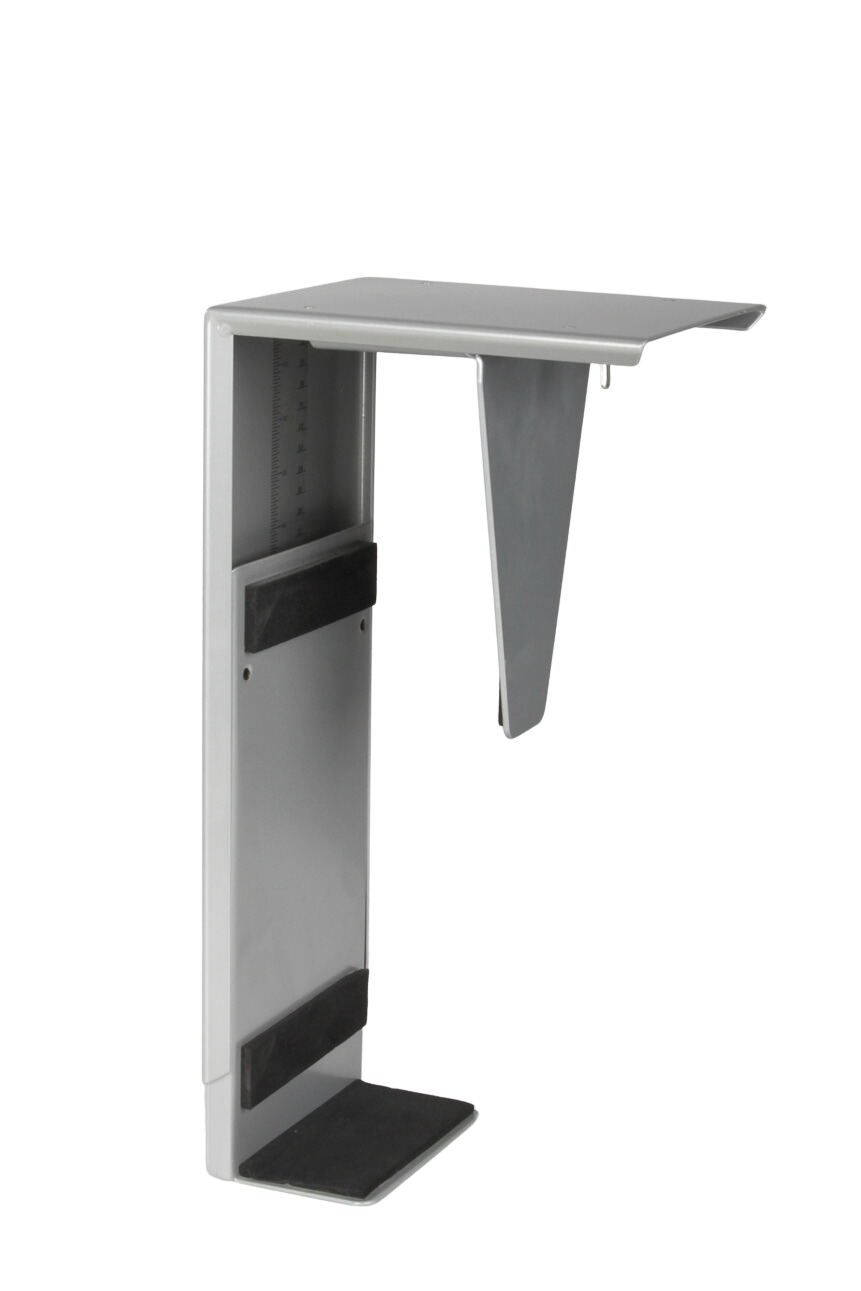 Computerholder/PC-holder i grå metal til montering under bordpladen på skrive- eller hæve-/sænkebordet.