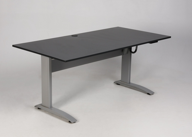 Conset elektrisk hæve-sænkebord med antracitgrå laminatbordplade, plastkant og centreret roset til gennemføring af kabler.