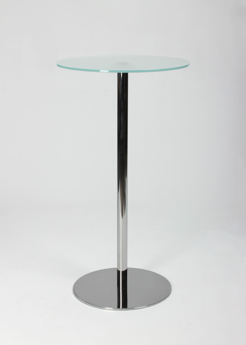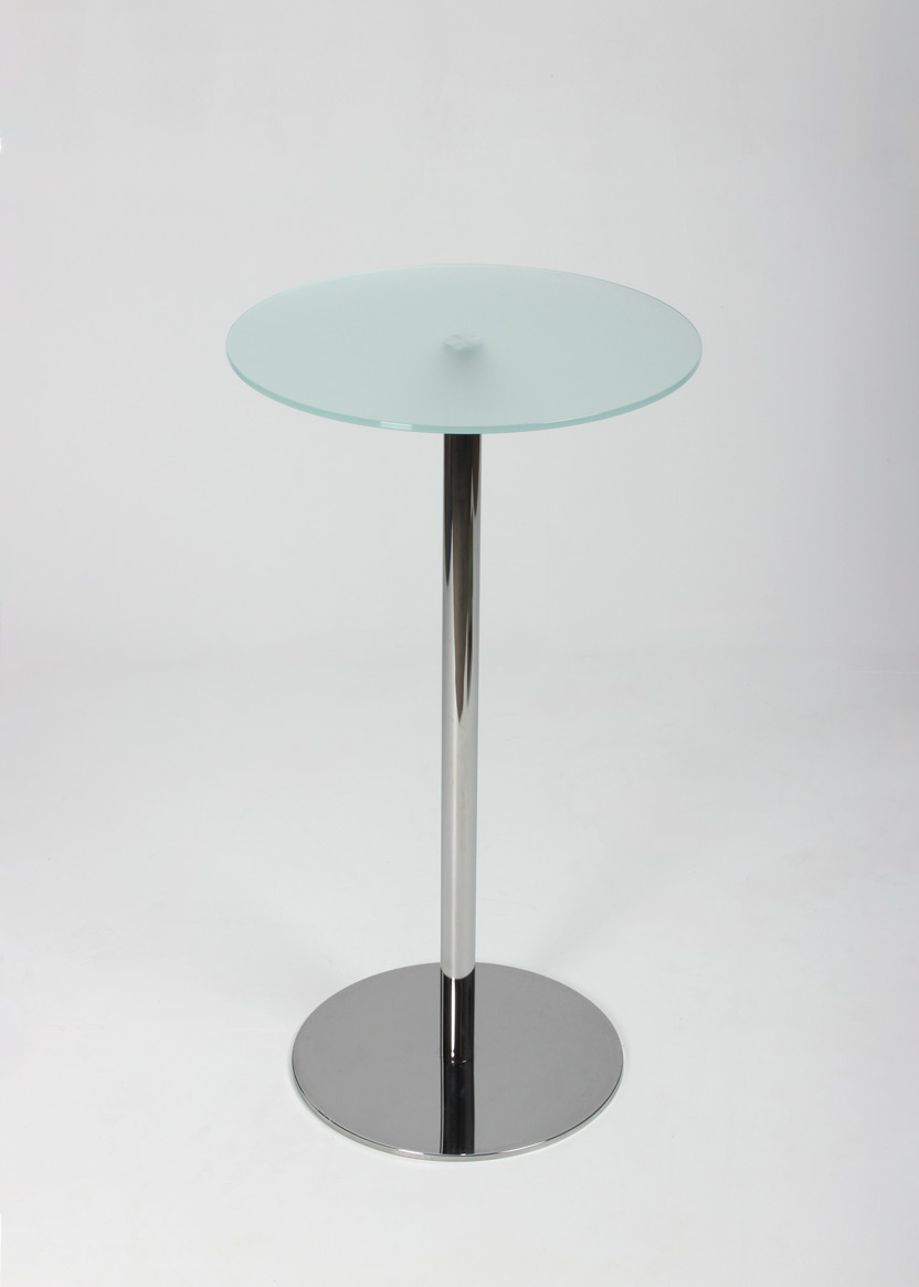 Circle højt højbord med rund bordplade i matteret glas med blankforkromet sokkel.