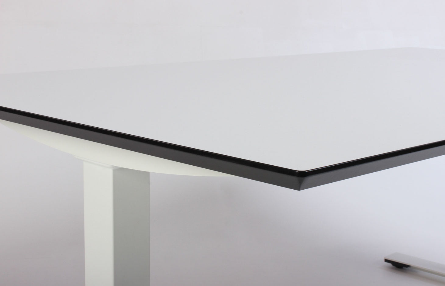 Fabriksny rektangulær MDF-bordplade i hvid laminat med affasede, lakerede kanter.