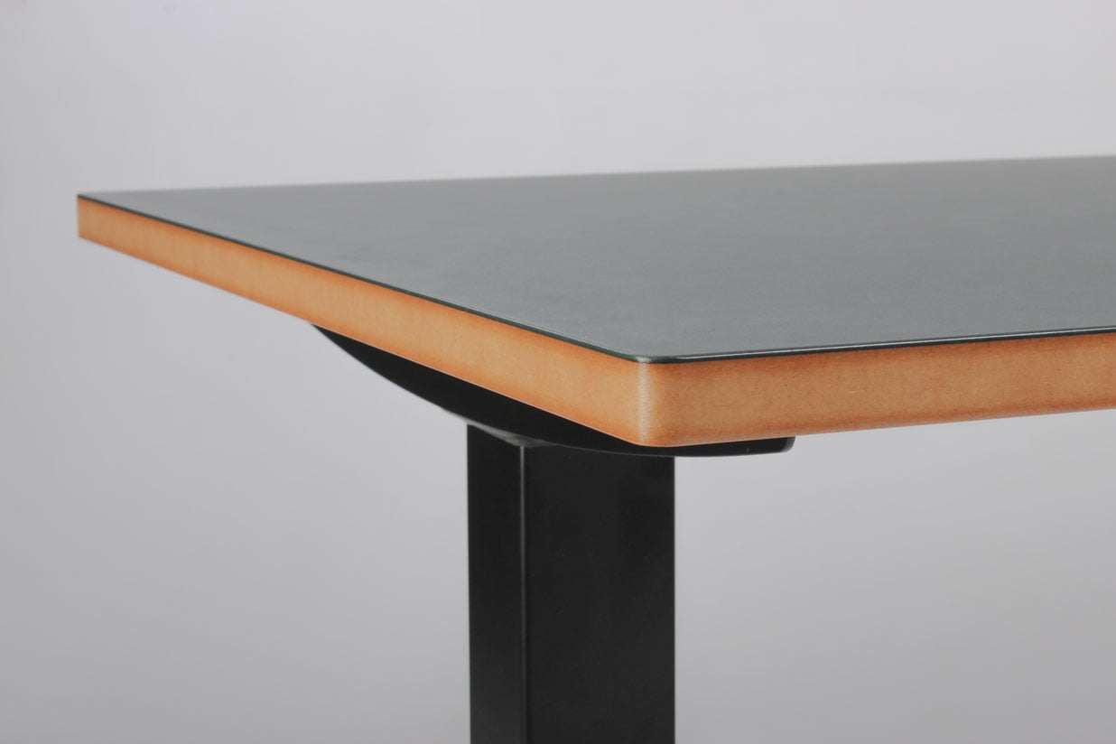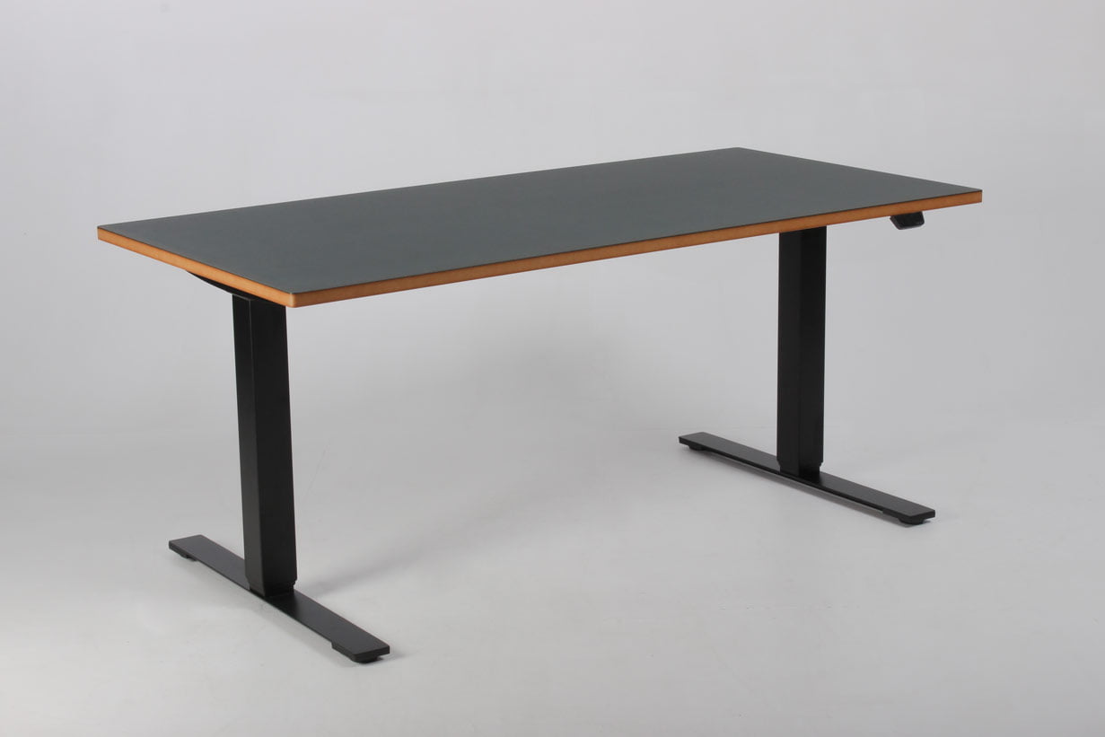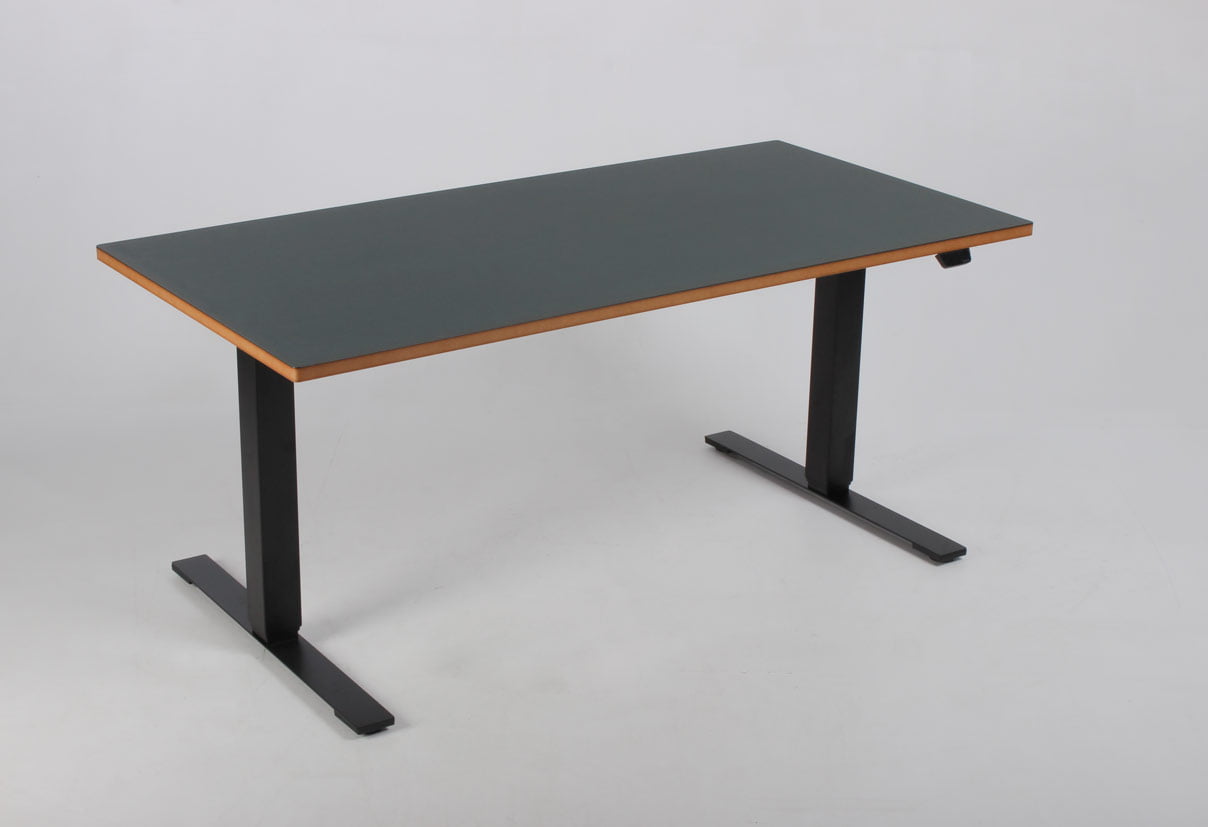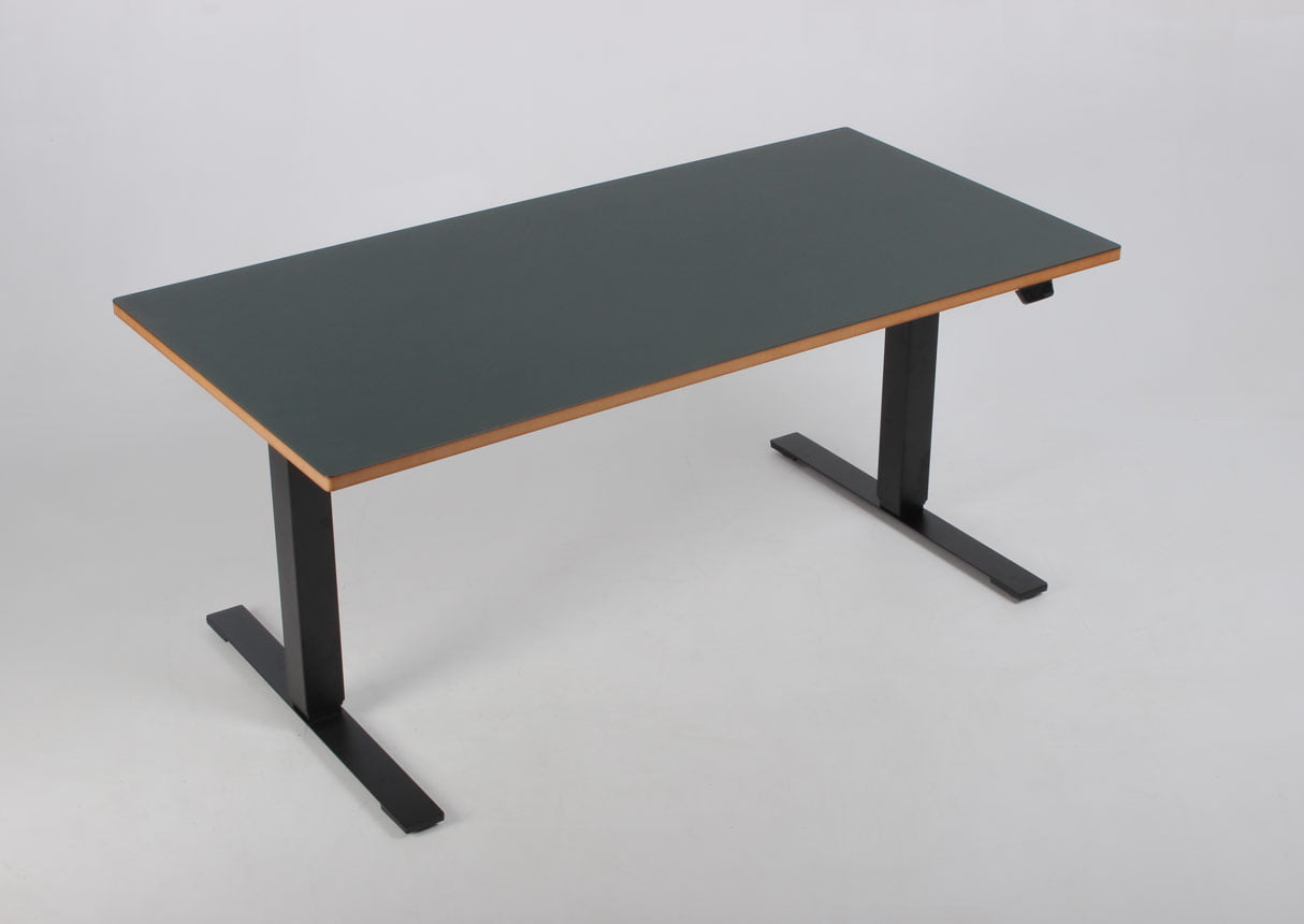 "Fabriksnyt Dencon hæve-sænkebord med rektangulær flaskegrøn (Conifer 4174) linoleumsbordplade, synlig MDF-kant og afrundede hjørner. Bordpladen er monteret på et sort Dencon Delta stel, der med to motorer og tre led kan justere højden fra 65-131 cm. Styringsenheden har digital visning af højden – en flot detalje, der giver bordets udseende et moderne løft og samtidig giver brugeren vished for, når den sædvanlige, foretrukne arbejdshøjde er nået. For et flot og funktionelt finish, se vores udvalg af tilbehør i form af bl.a. kabelbakker, kabelrosetter, computerholdere og udtræksskuffer – vi monterer det gratis.
