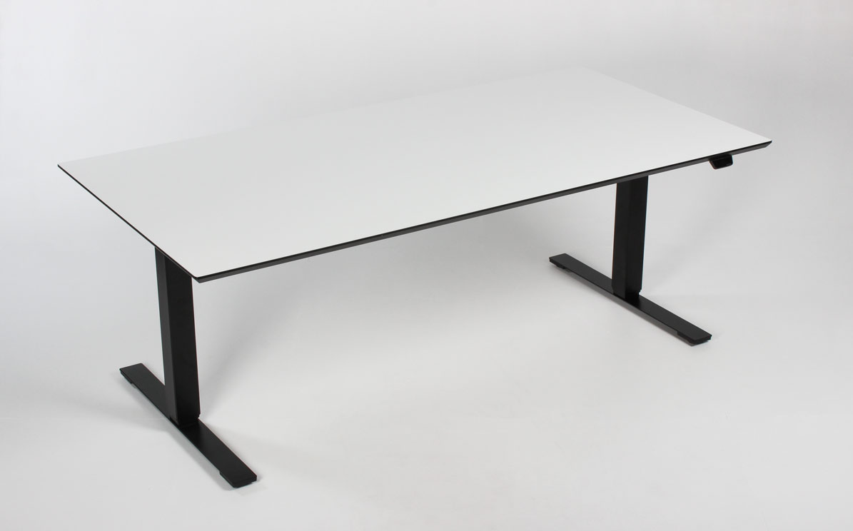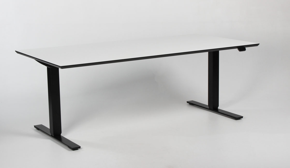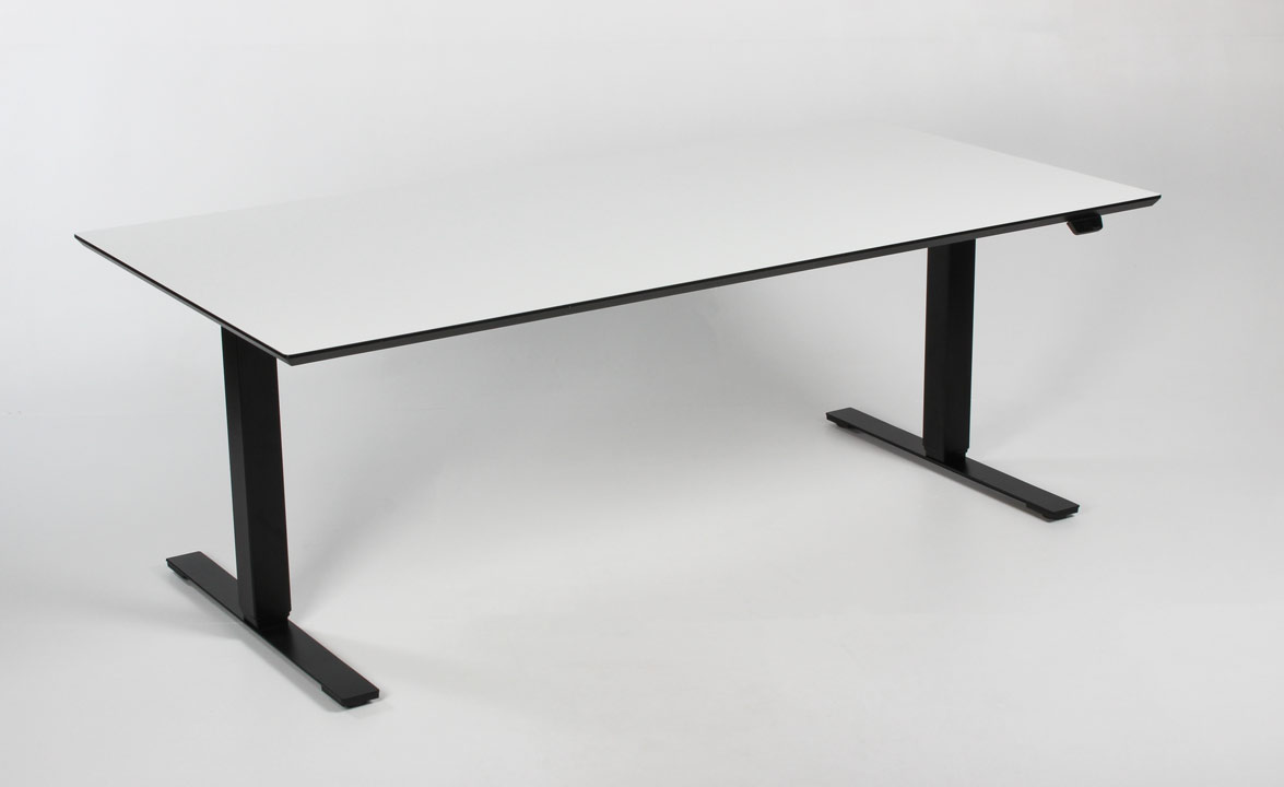 "Fabriksnyt Dencon Delta hæve-sænkebord med hvid laminatbordplade og sorte kanter på sort stel. Bordets stel er udstyret med to motorer og tre led der justerer højden fra 65-131 cm. Styringsenheden har digital visning af højden – en flot detalje, der giver bordets udseende et moderne løft og samtidig giver brugeren vished for, når den sædvanlige, foretrukne arbejdshøjde er nået. For et flot og funktionelt finish, se vores udvalg af tilbehør i form af bl.a. kabelrosetter, computerholdere og kabelbakker – vi monterer det GRATIS!