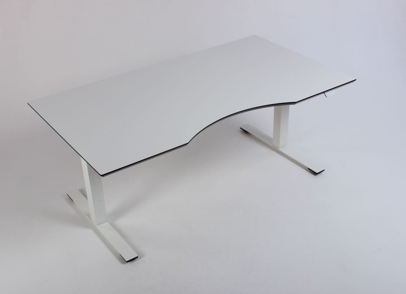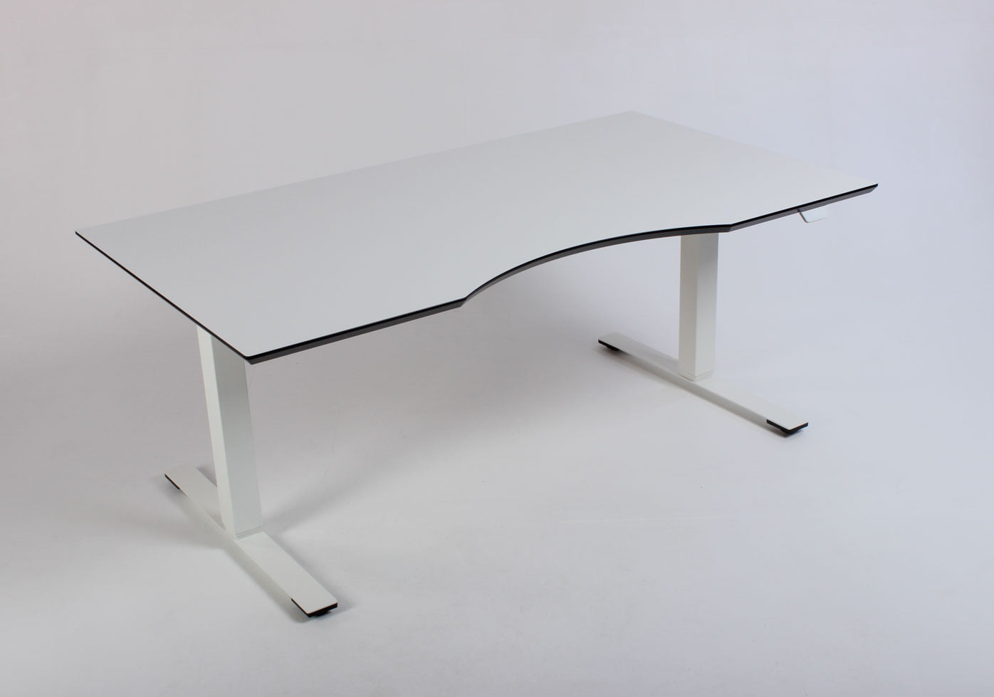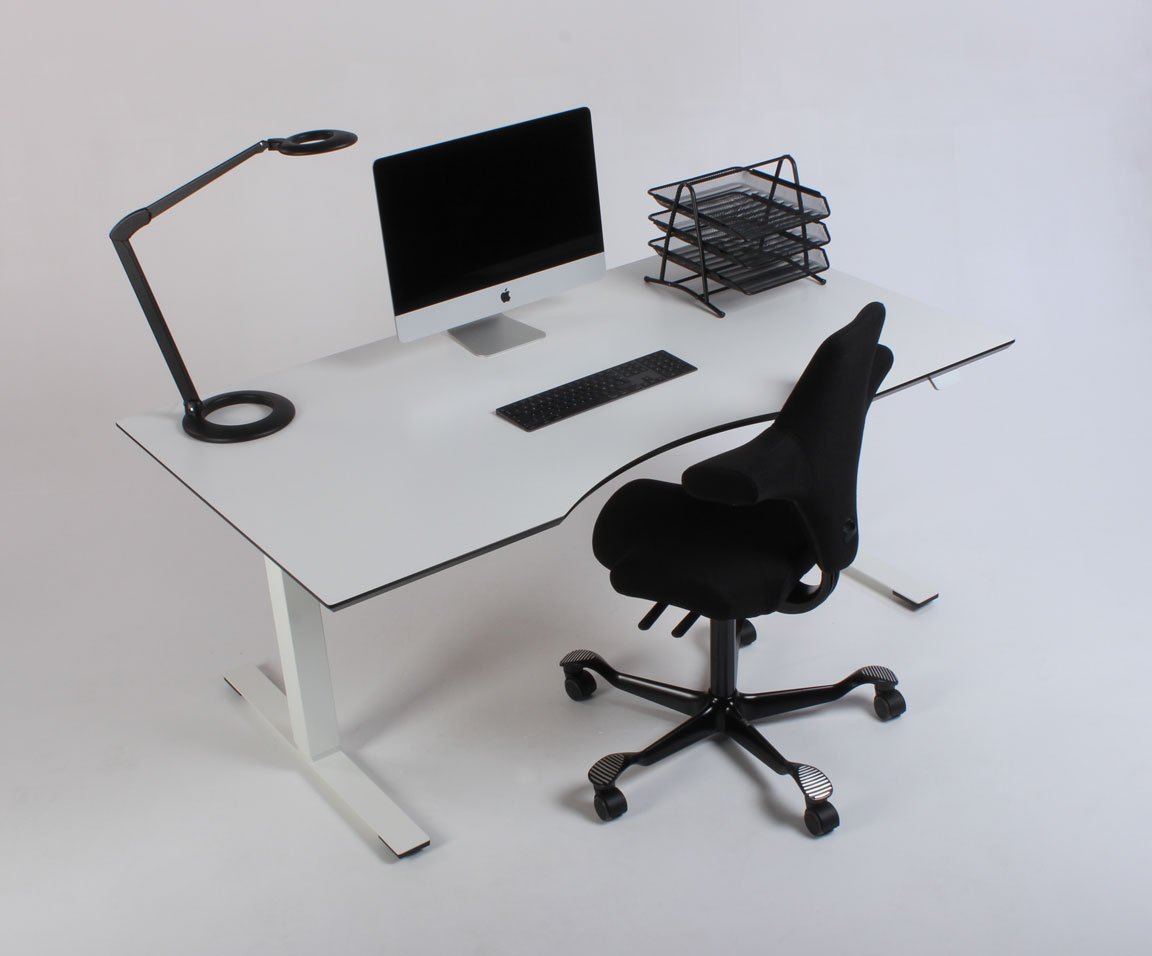 "Fabriksnyt Dencon Delta hæve-sænkebord med hvid laminatbordplade med mavebue, og sorte affasede kanter på hvidt stel.