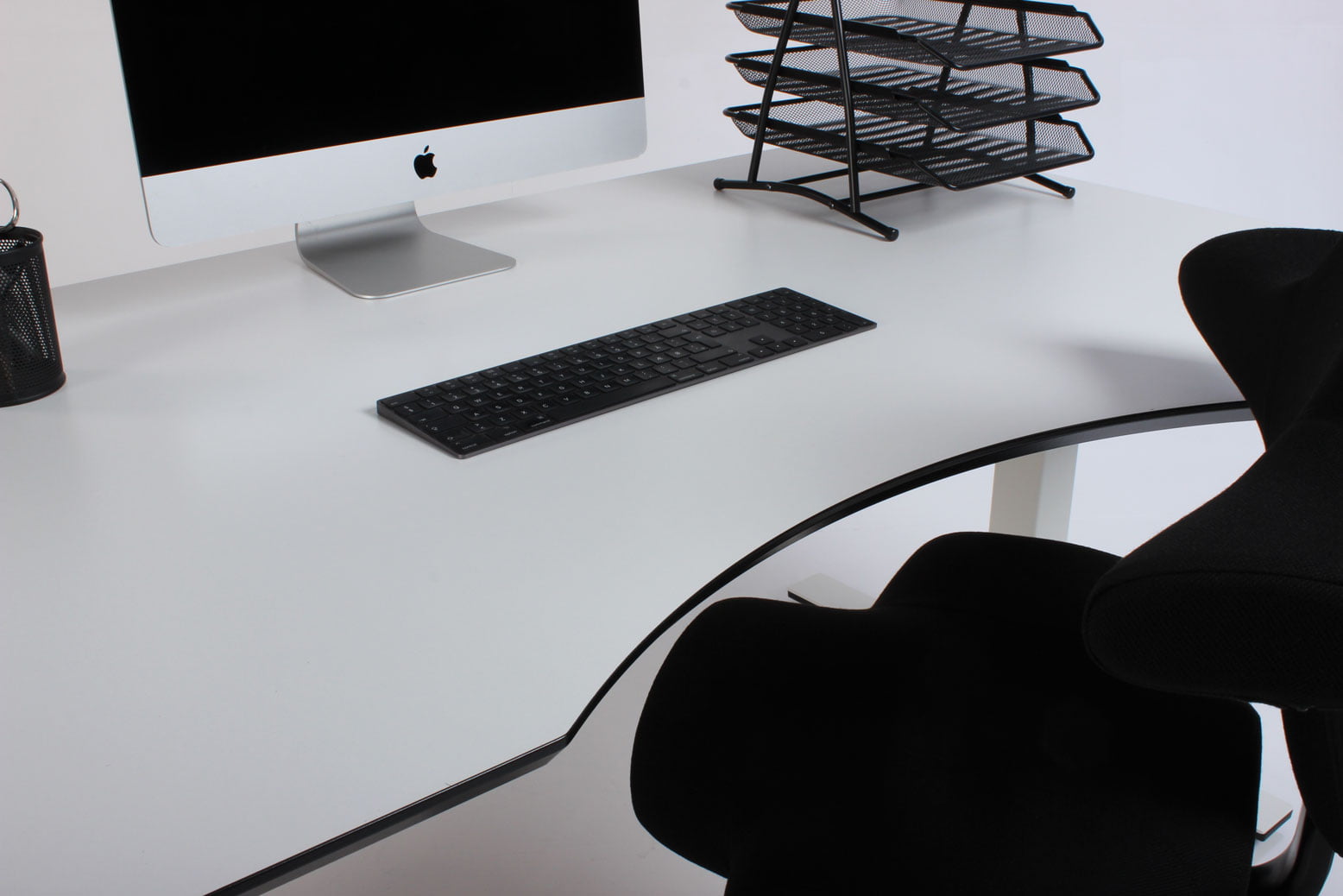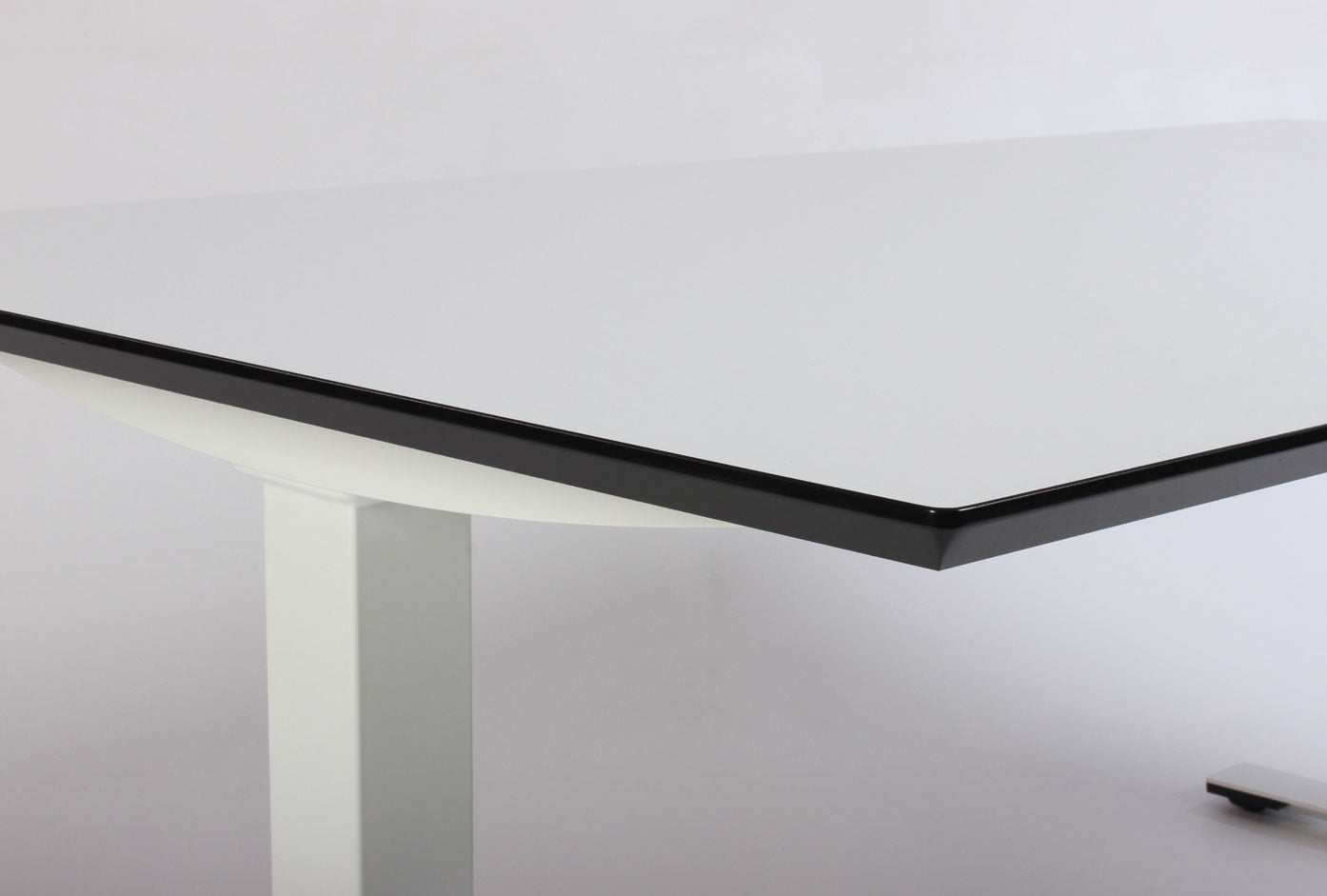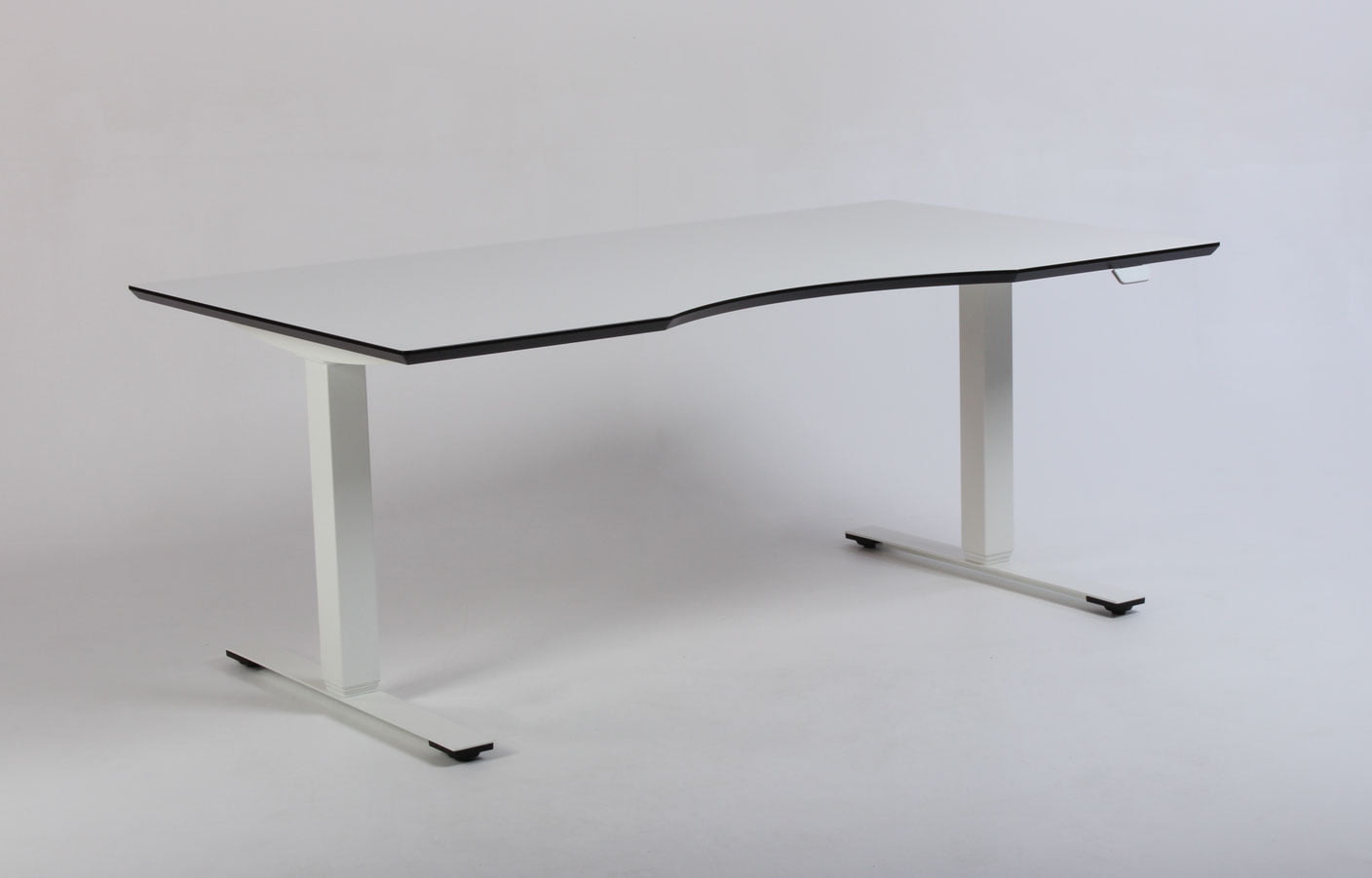 "Fabriksnyt Dencon Delta hæve-sænkebord med hvid laminatbordplade med mavebue, og sorte affasede kanter på hvidt stel.