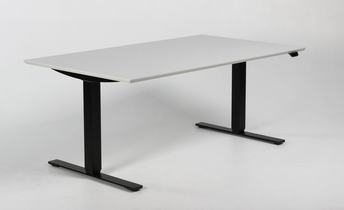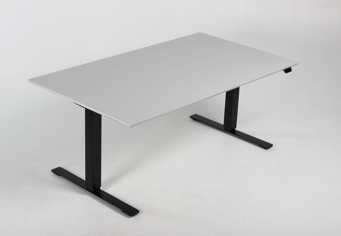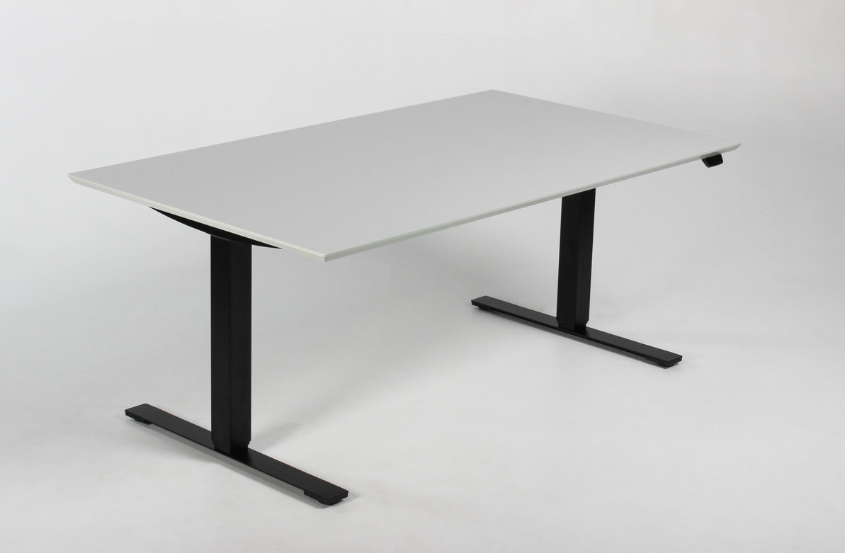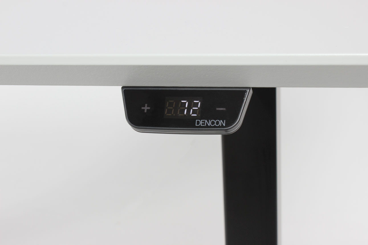 "Fabriksnyt Dencon Delta hæve-sænkebord med lys grå laminatbordplade. Bordets sorte stel er udstyret med to motorer og tre led der justerer højden fra 65-131 cm. Styringsenheden har digital visning af højden – en flot detalje, der giver bordets udseende et moderne løft og samtidig giver brugeren vished for, når den sædvanlige, foretrukne arbejdshøjde er nået. For et flot og funktionelt finish, se vores udvalg af tilbehør i form af kabelrosetter, kabelbakker og udtræksskuffer – vi monterer det GRATIS!