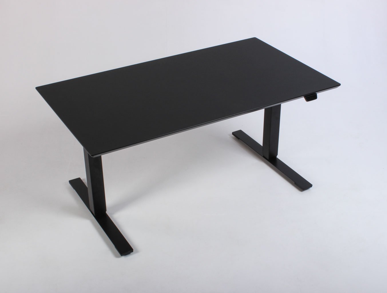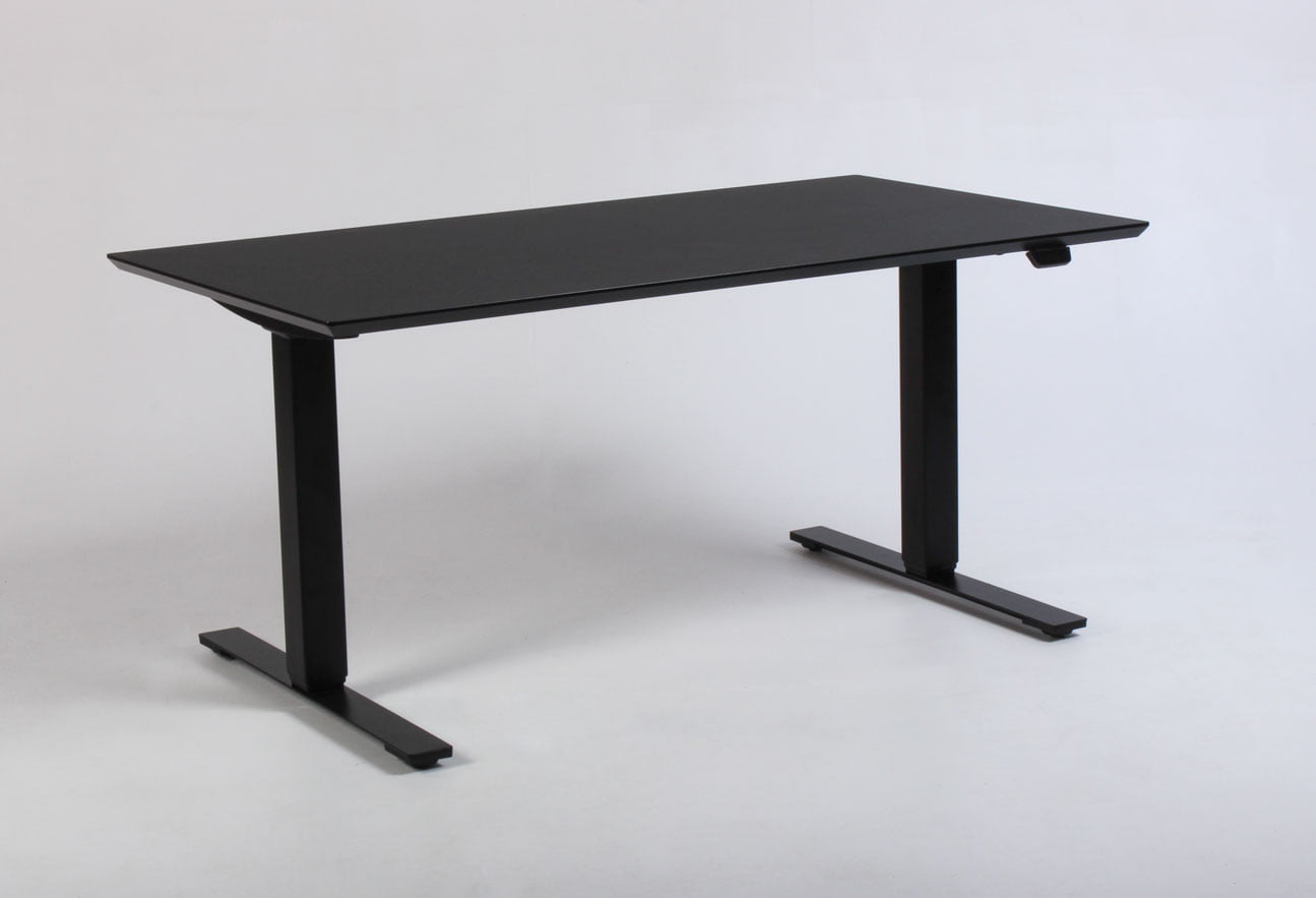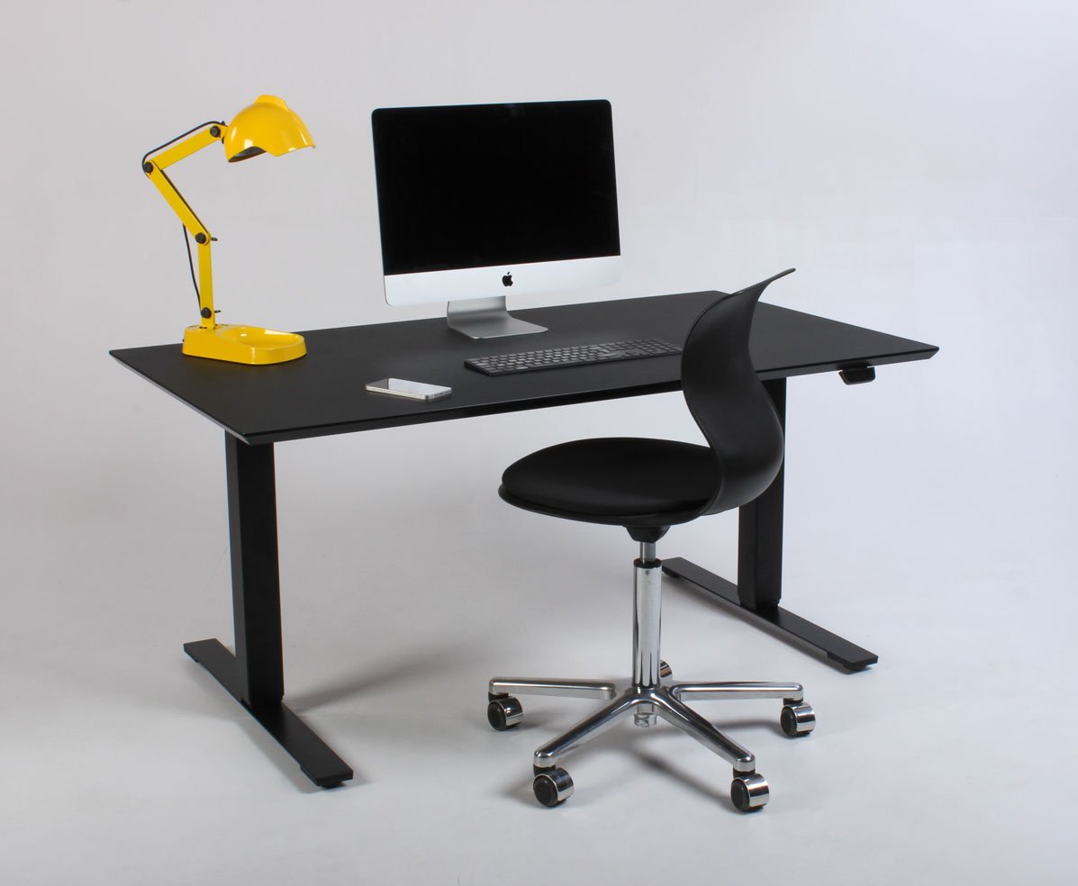 "Dencon Delta hæve-sænkebord med sort linoleumsbordplade, med affasede kanter på sort stel. Bordets stel er udstyret med to motorer og tre led der justerer højden fra 65-131 cm. Styringsenheden har digital visning af højden – en flot detalje, der giver bordets udseende et moderne løft og samtidig giver brugeren vished for, når den sædvanlige, foretrukne arbejdshøjde er nået. Se også vores udvalg af kabelrosetter, kabelbakker og udtræksskuffer for et flot og funktionelt finish – vi monterer tilbehør GRATIS!