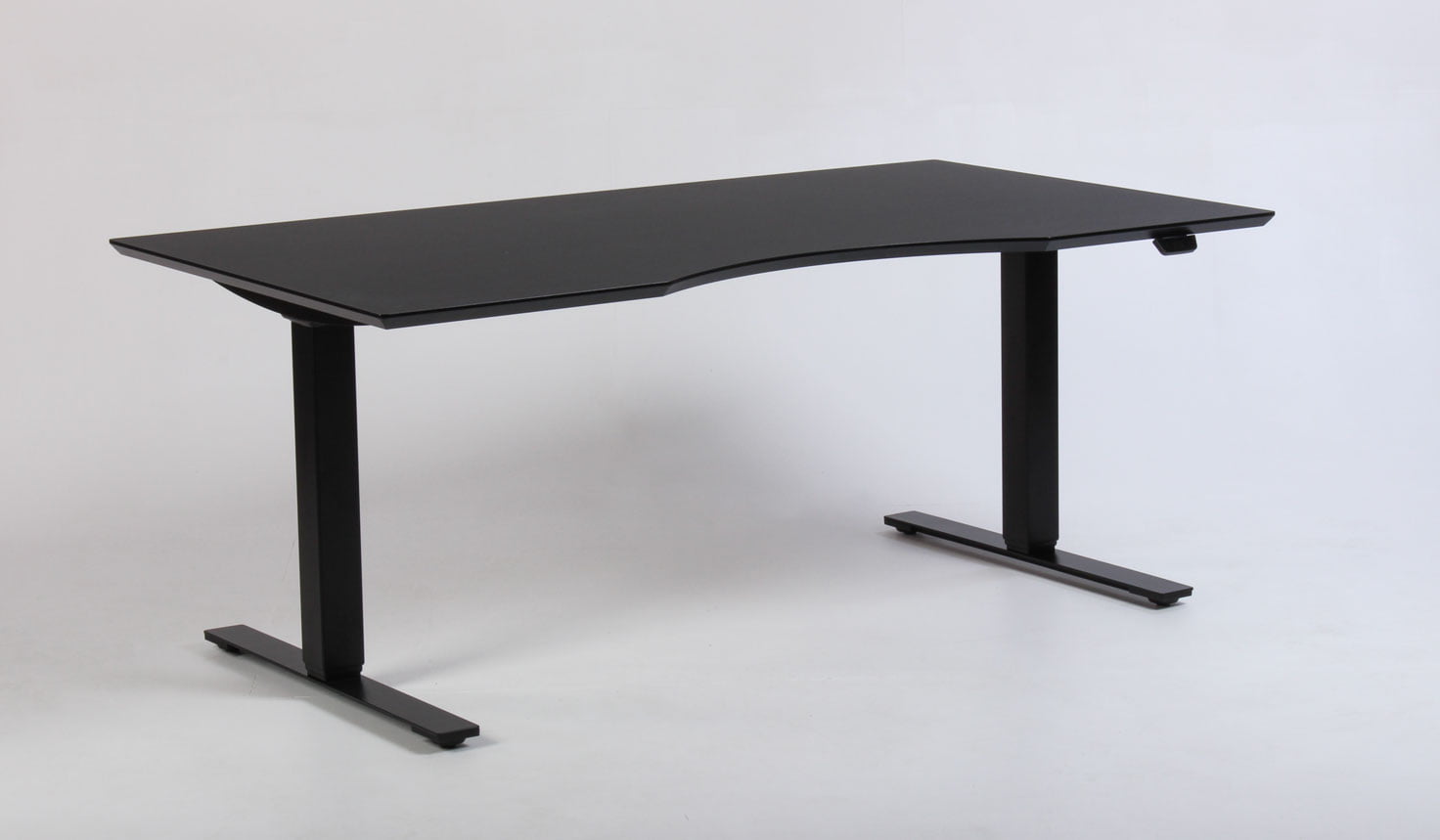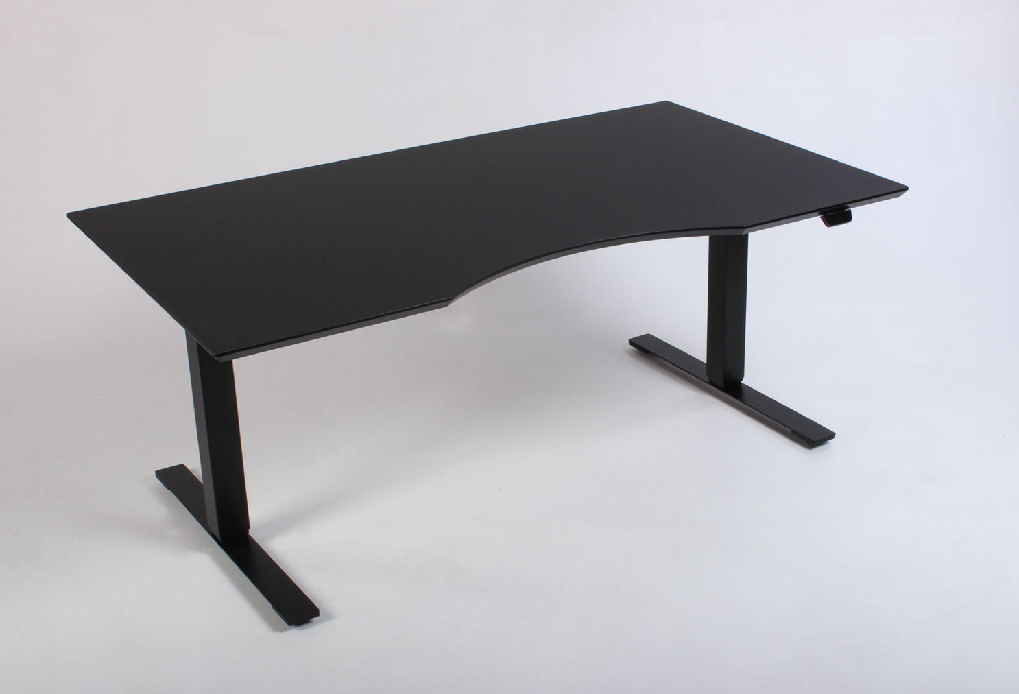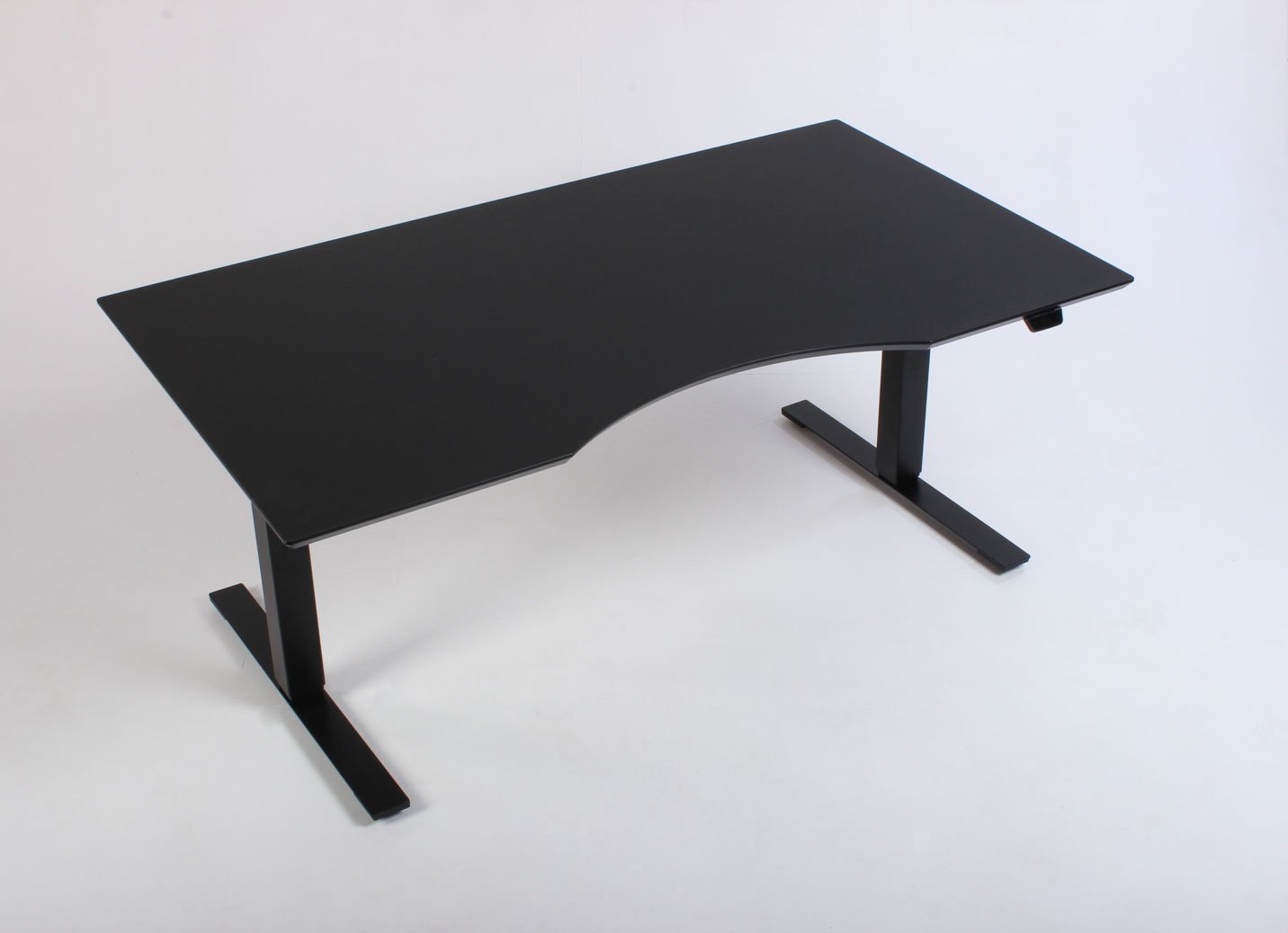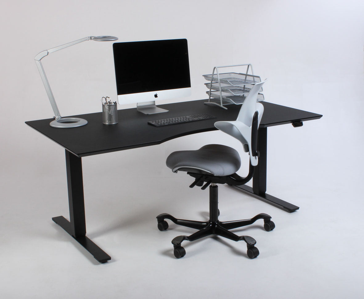 "Dencon Delta hæve-sænkebord med sort linoleumsbordplade, med mavebue og affasede kanter på sort stel. Bordets stel er udstyret med to motorer og tre led der justerer højden fra 65-131 cm. Styringsenheden har digital visning af højden – en flot detalje, der giver bordets udseende et moderne løft og samtidig giver brugeren vished for, når den sædvanlige, foretrukne arbejdshøjde er nået. For et flot og funktionelt finish, se vores udvalg af tilbehør i form af kabelrosetter, kabelbakker og udtræksskuffer – vi monterer det GRATIS!
