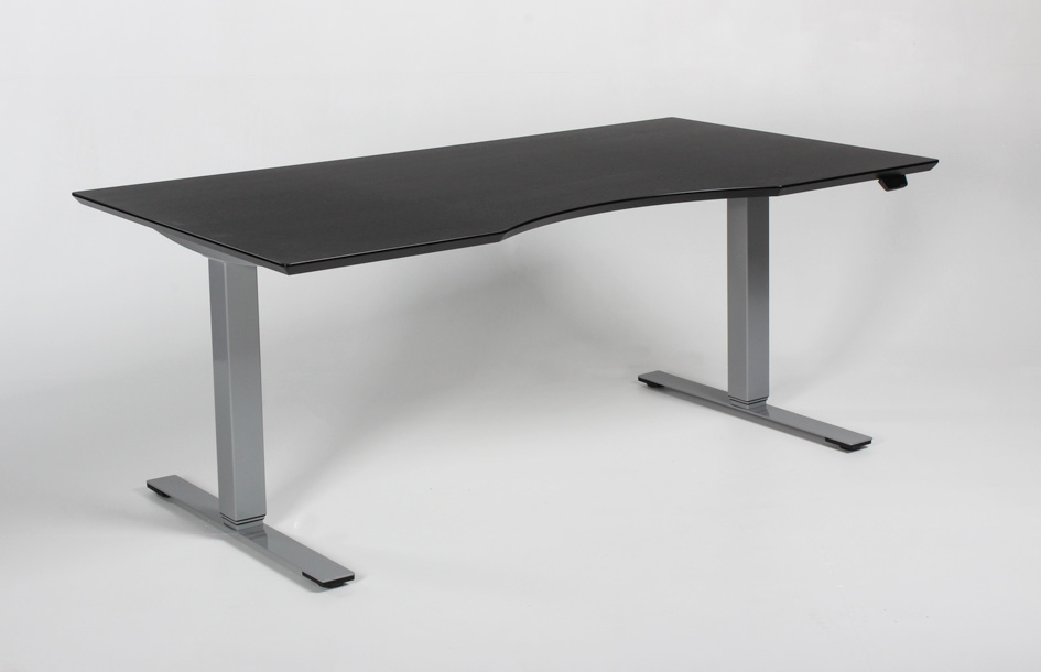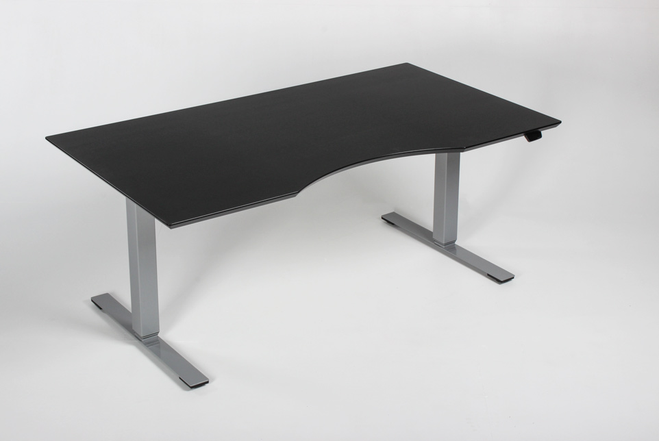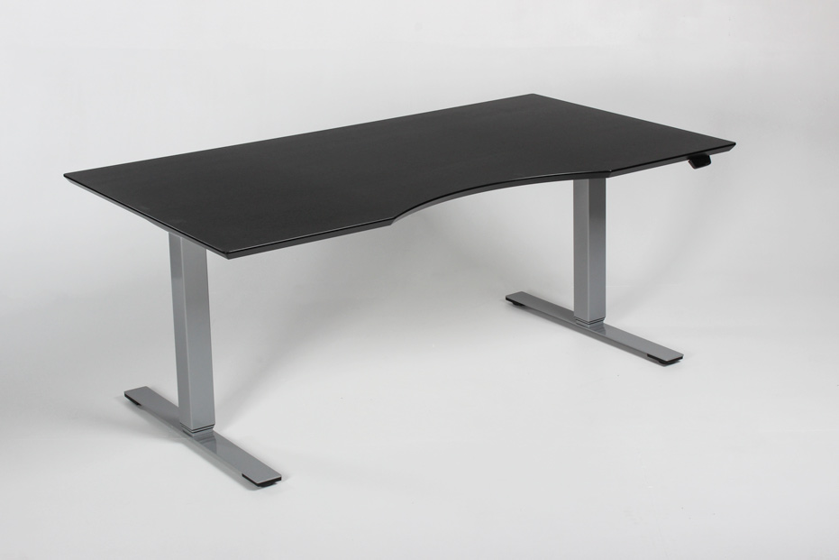 "Dencon Delta hæve-sænkebord med sort linoleumsbordplade med mavebue og gråt stel. Bordets stel er udstyret med to motorer og tre led der justerer højden fra 65-131 cm. Styringsenheden har digital visning af højden – en flot detalje, der giver bordets udseende et moderne løft og samtidig giver brugeren vished for, når den sædvanlige, foretrukne arbejdshøjde er nået. For et flot og funktionelt finish, se vores udvalg af tilbehør i form af kabelrosetter, kabelbakker og udtræksskuffer – vi monterer det GRATIS!