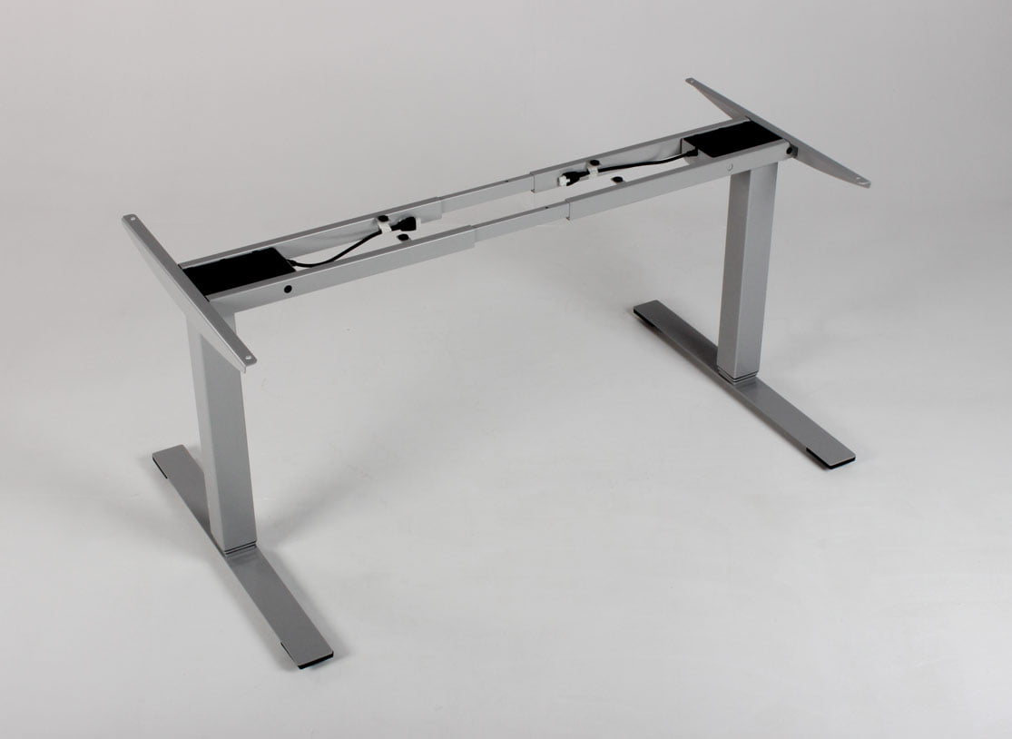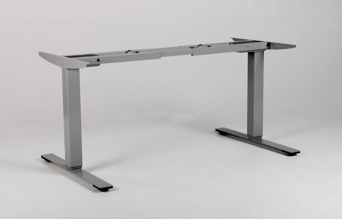 "Dencon Delta hæve-sænkestel i grå. Det dansk producerede stel er justerbart så det kan anvendes til bordplader fra 120-200 cm, og har en maximal løftekapacitet på 100 kg. De to motorer og tre led justerer højden fra 65-131 cm, og kan følges på den lille digitale betjeningsenhed, så brugeren har vished for, når den sædvanlige, foretrukne arbejdshøjde er nået.
